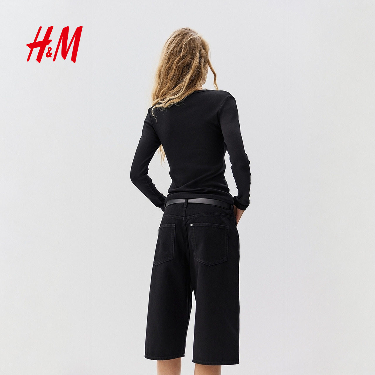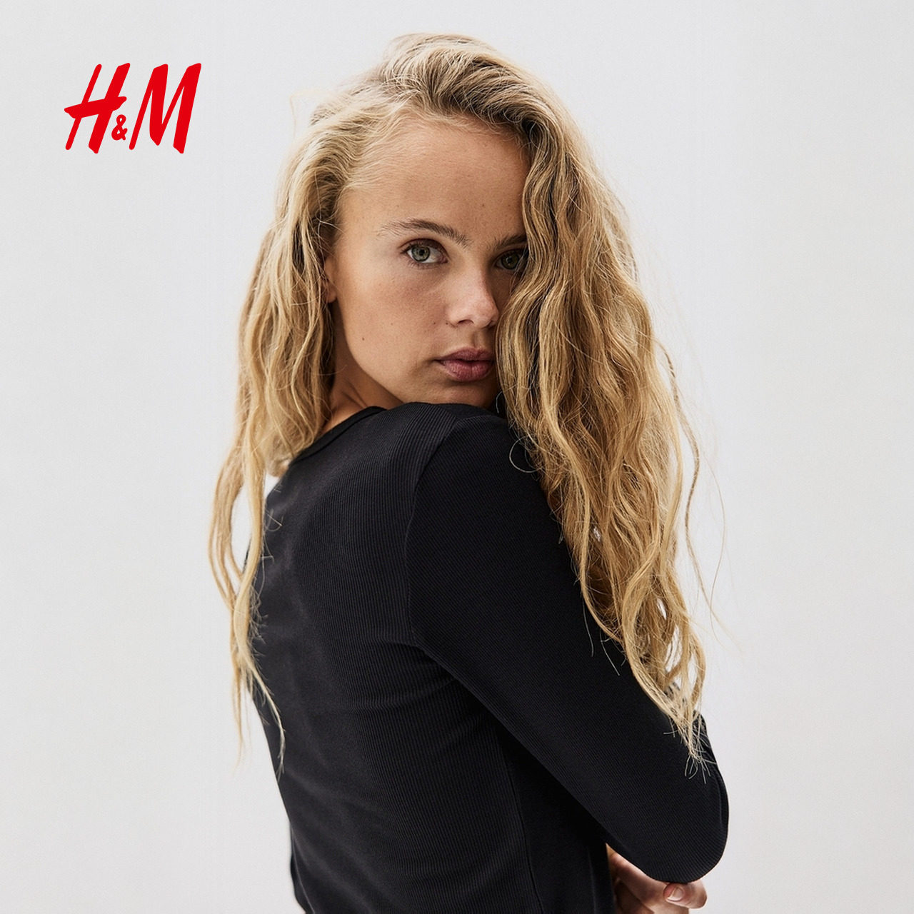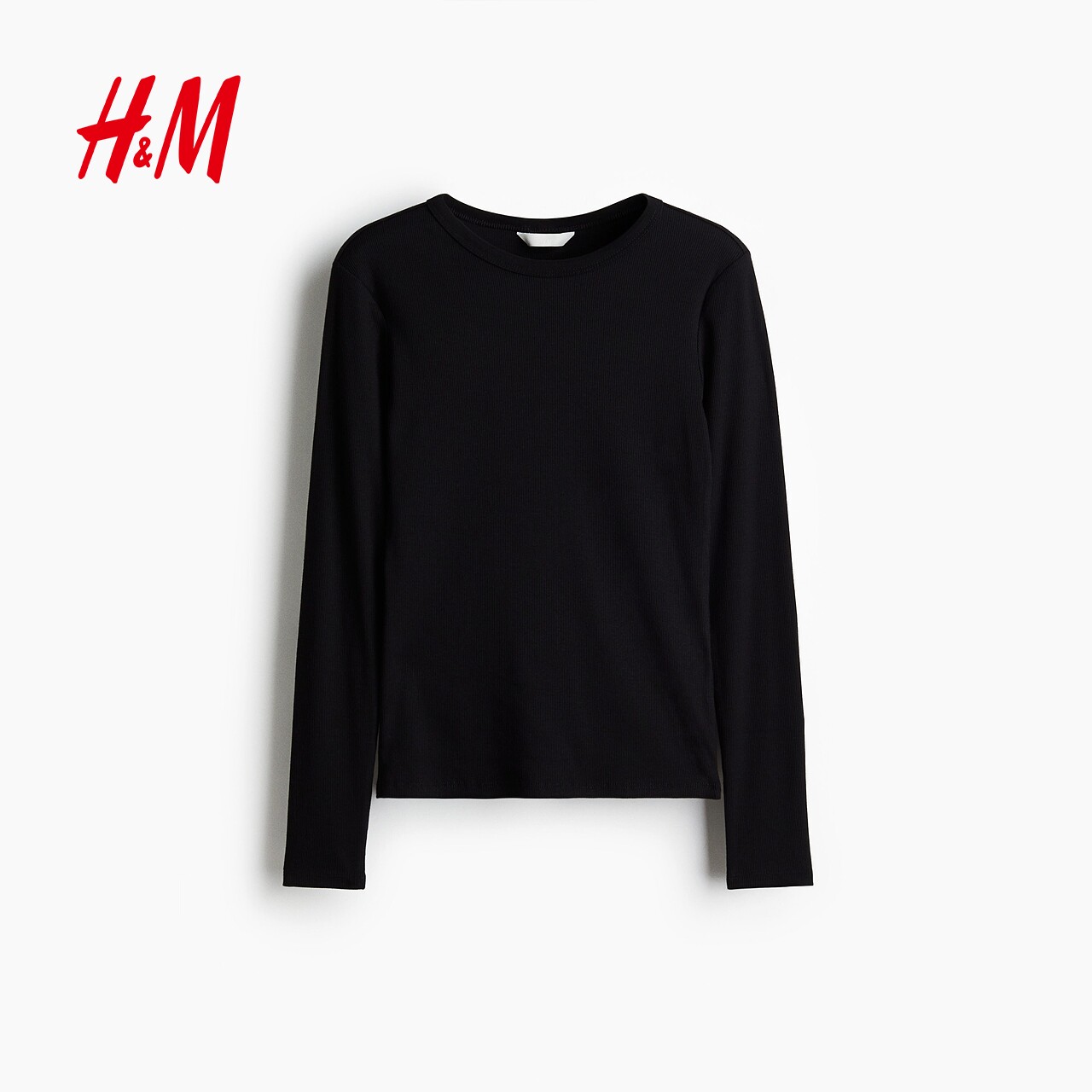 HM女装T恤春季休闲时尚修身打底圆领棉质罗纹棉质长袖上衣1260555
