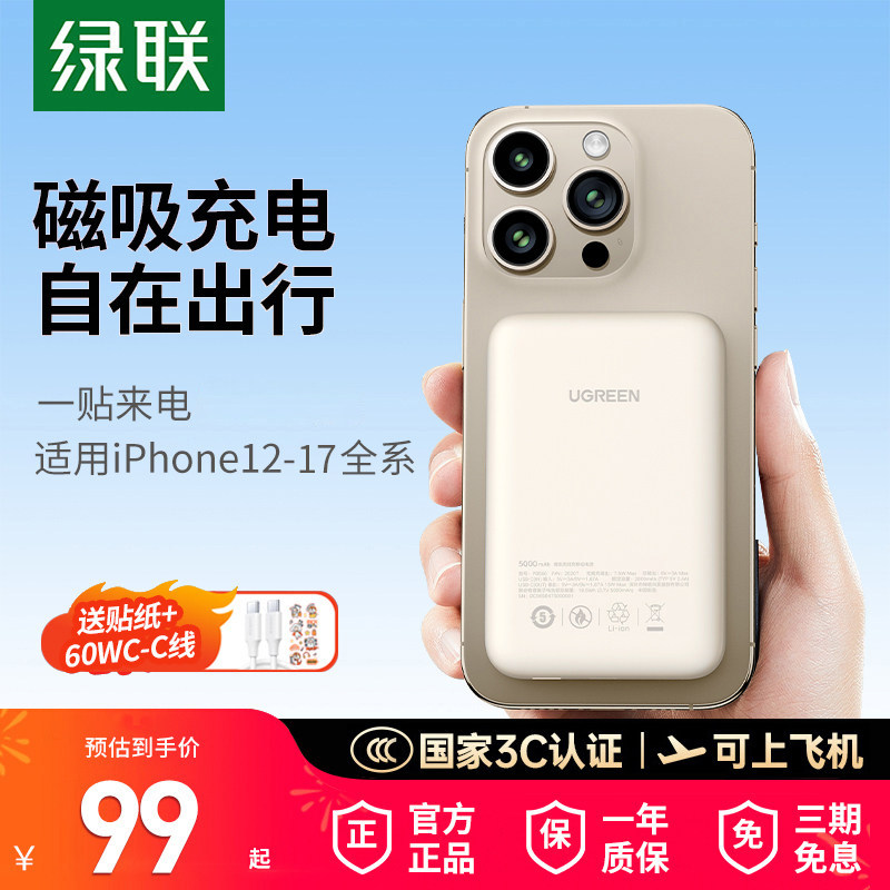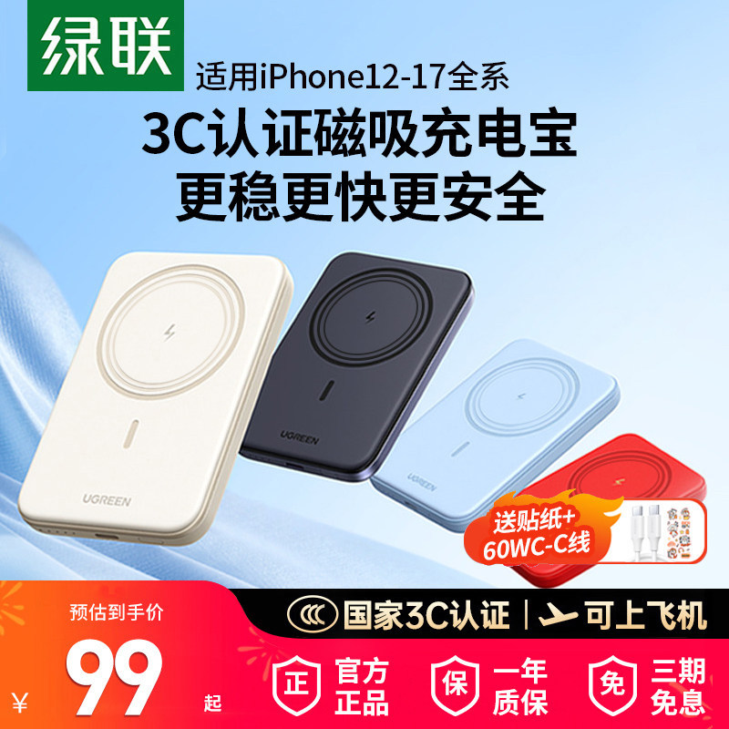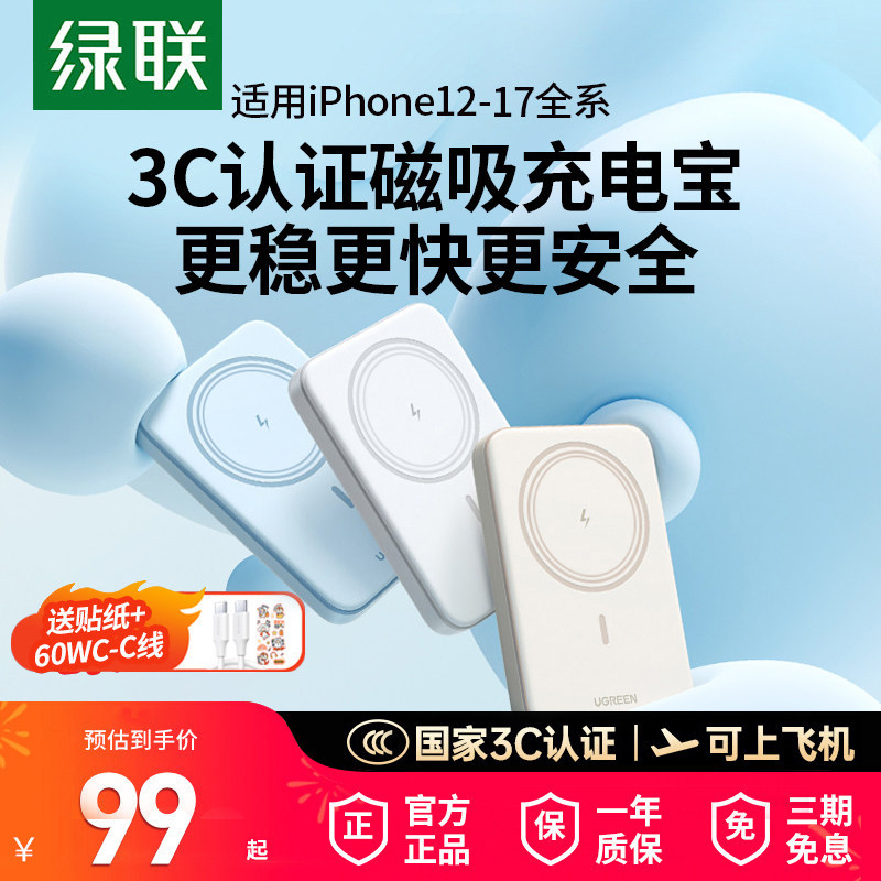 【3C认证】绿联磁吸无线充电宝10000毫安适用于iPhone17/16手机超薄小巧便携Magsafe外接电池自带线移动电源