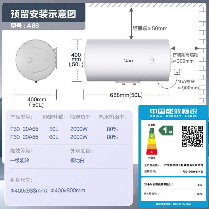 美的60升家用电热水器速热一级节能50升租房小型储水式A66