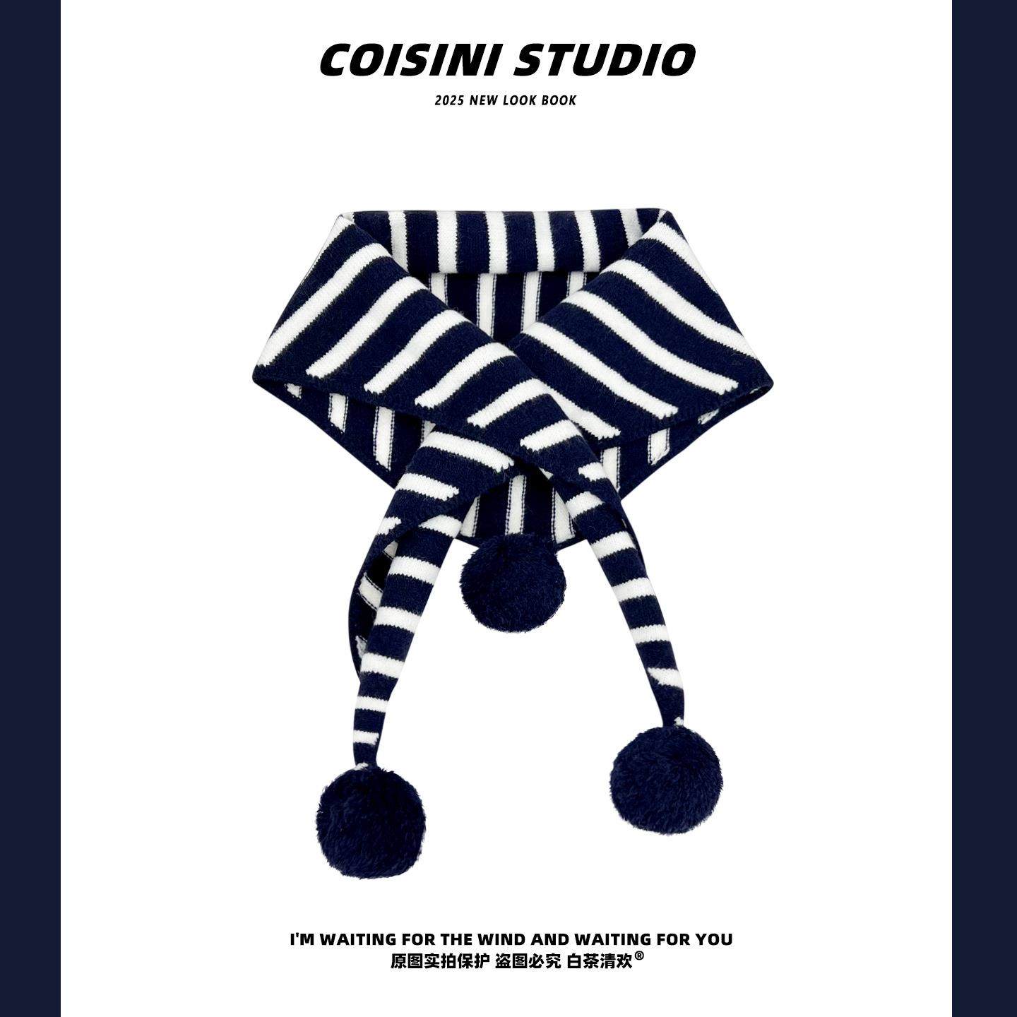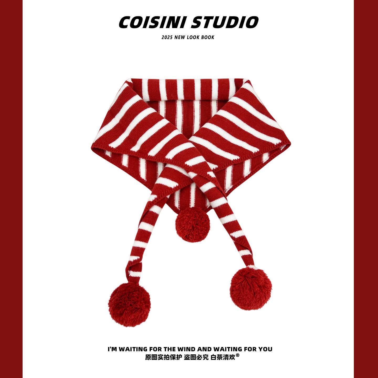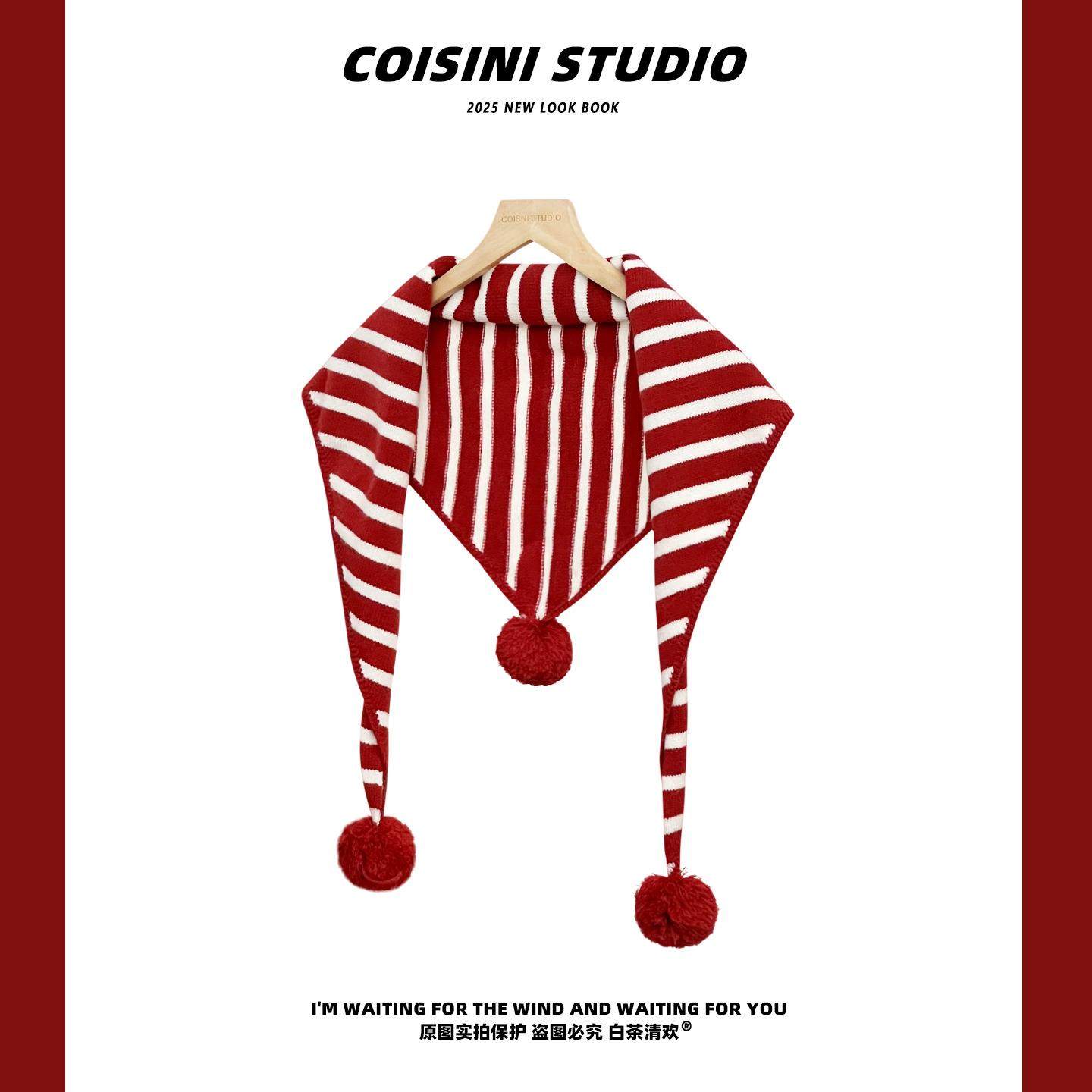 2025新款可爱球球红色条纹三角围巾女秋冬保暖披肩围脖潮白茶清欢