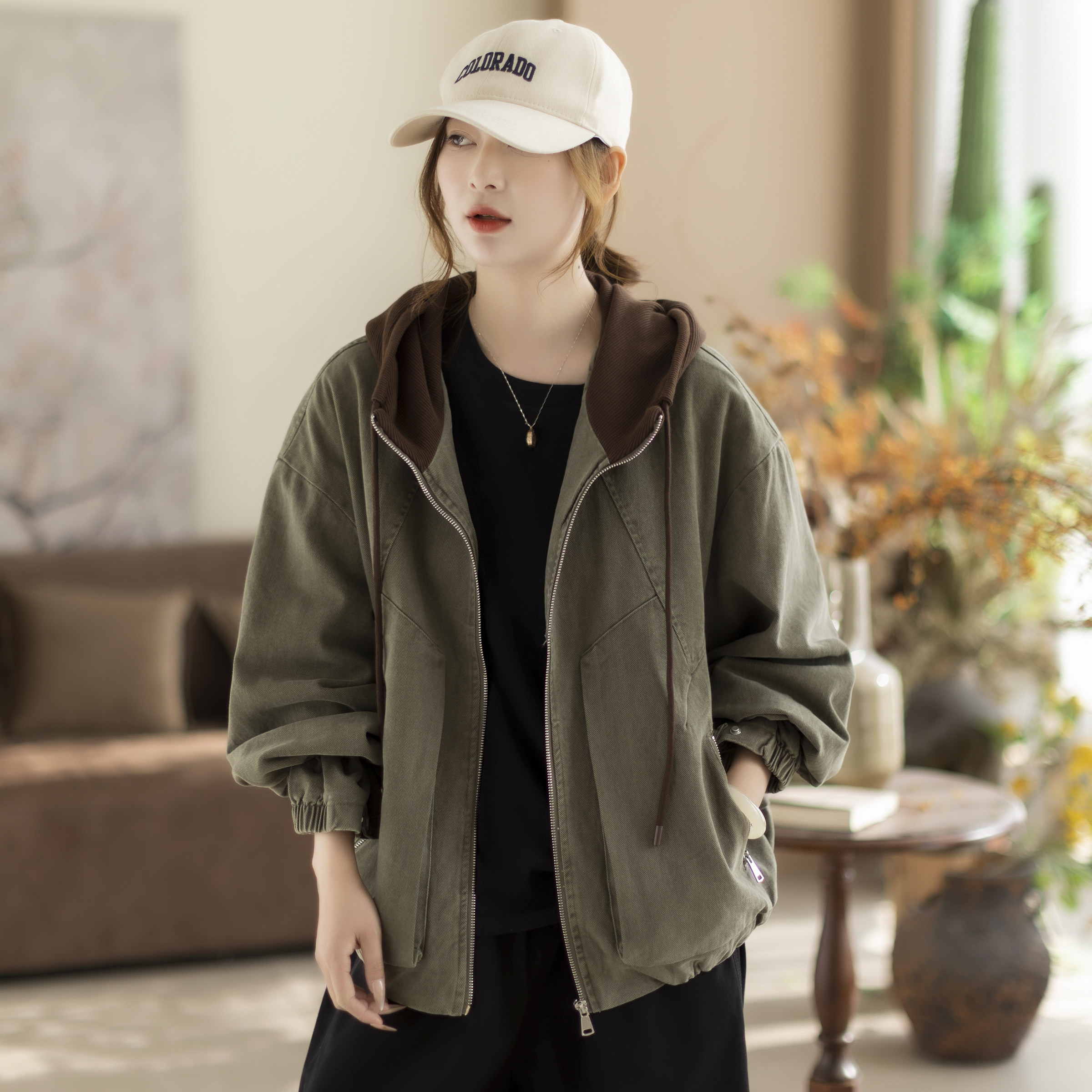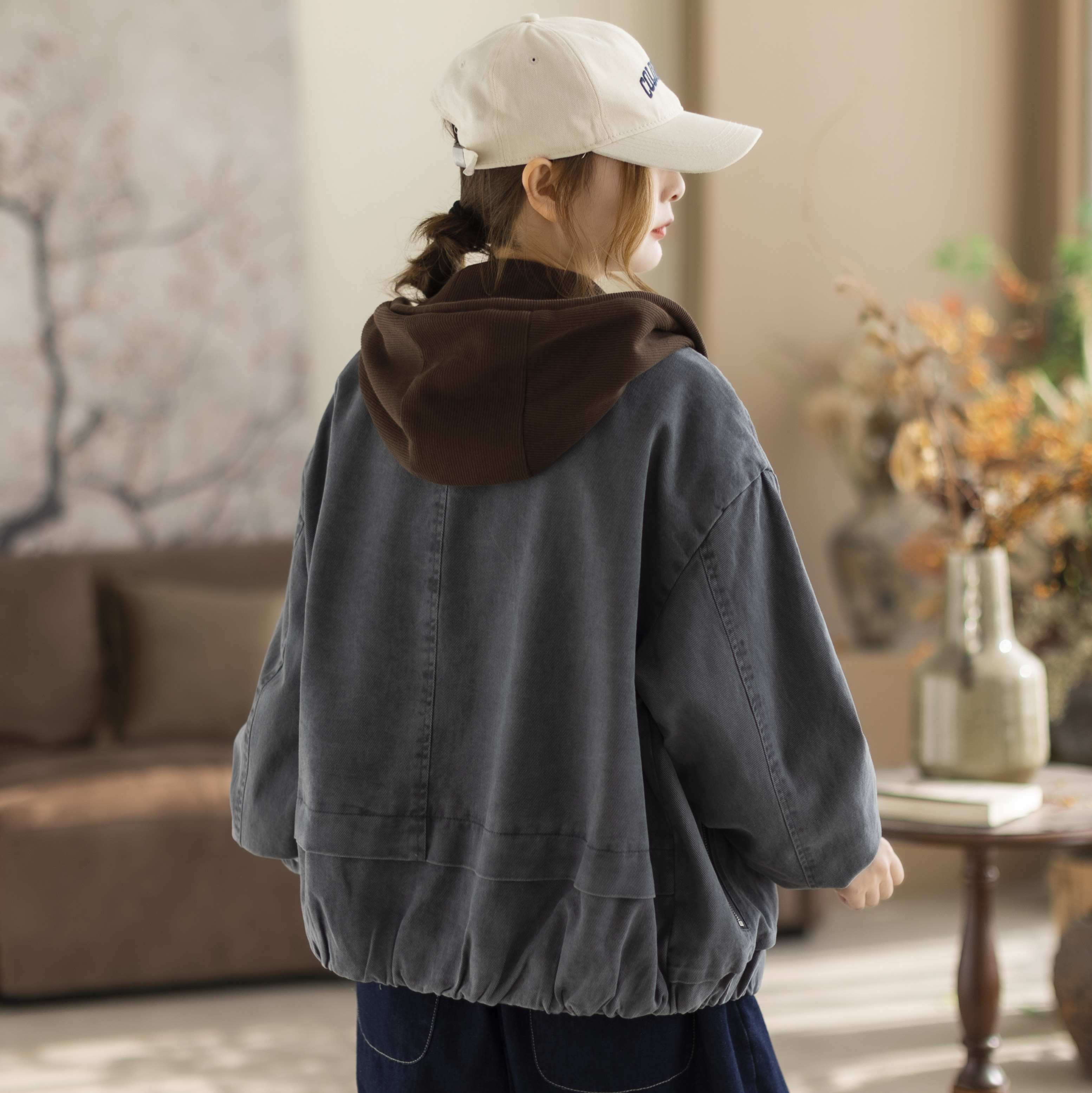 咖咪羽牛仔外套女春秋新款女士连帽做旧洋气休闲宽松拼接女装上衣