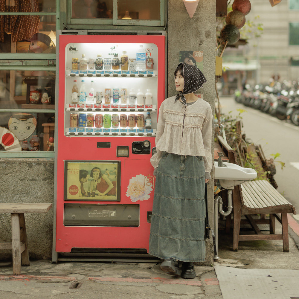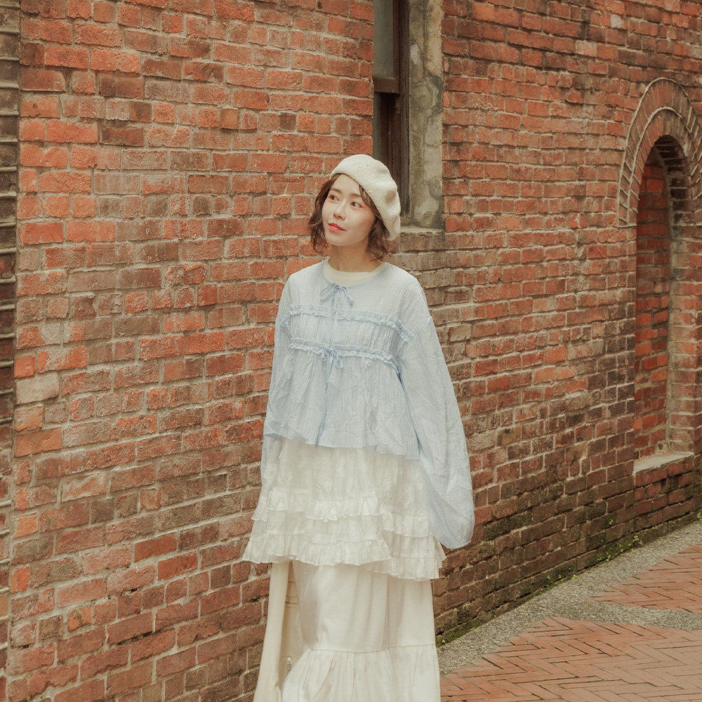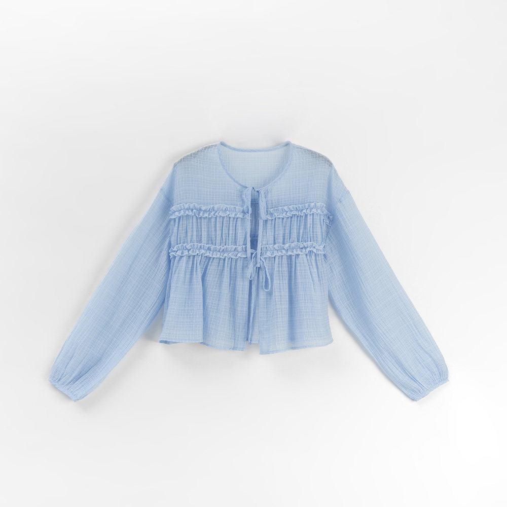 QUEENSHOP 2026春夏新品女装透肤织纹荷叶剪接绑带罩衫01099568