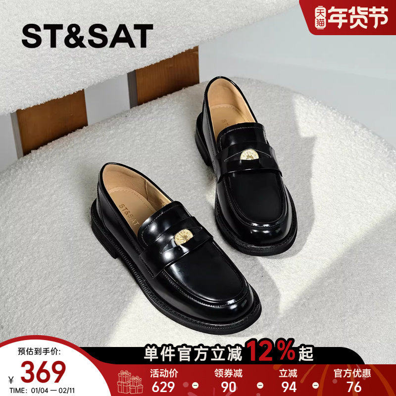 星期六真皮乐福鞋女山茶花新款秋季女鞋平底单鞋英伦风黑色小皮鞋