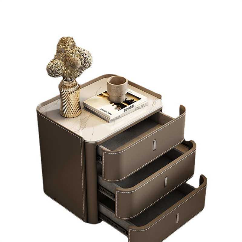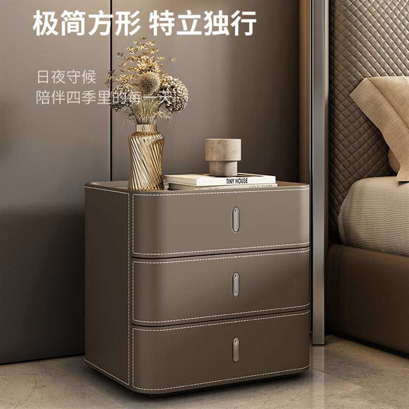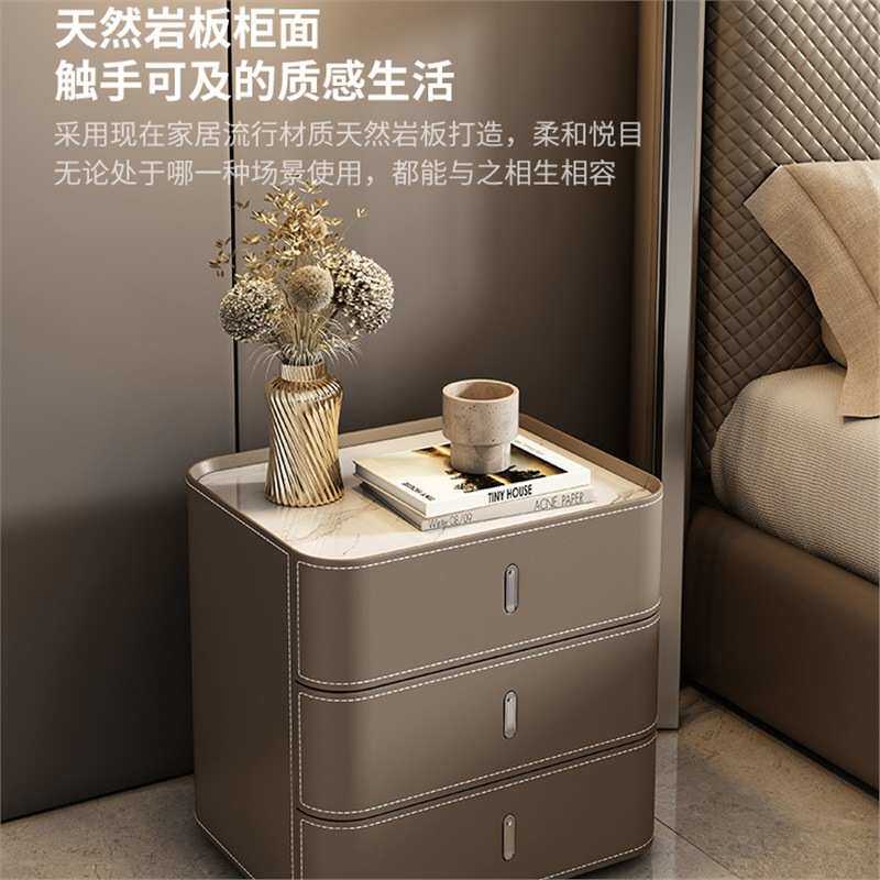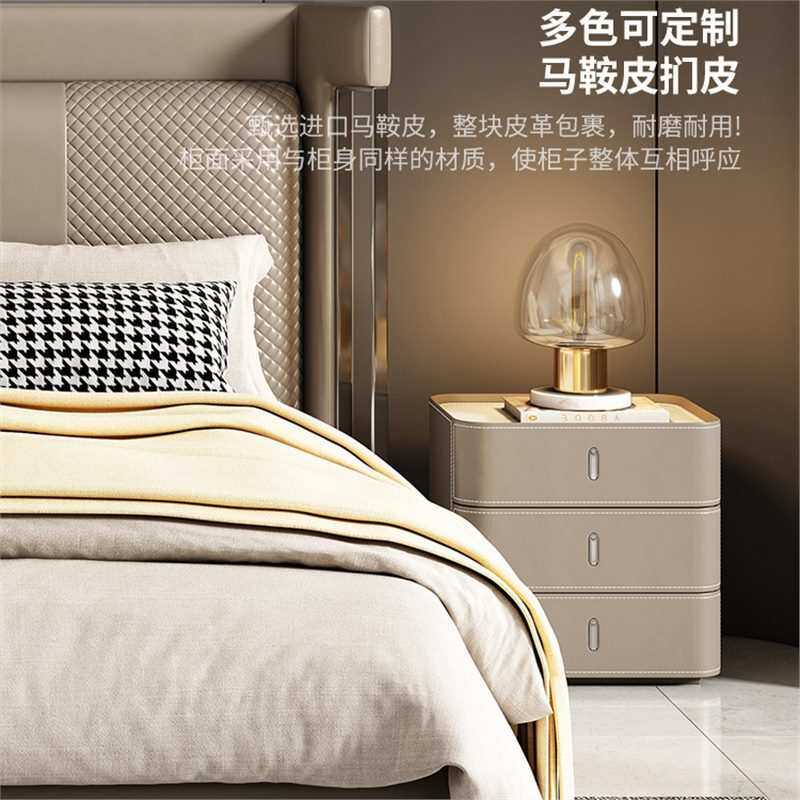 高端意式极简方形马鞍皮床头柜轻奢岩板卧室床边柜现代简约三斗柜