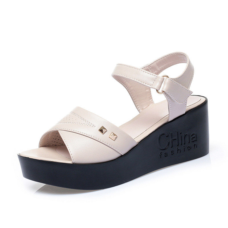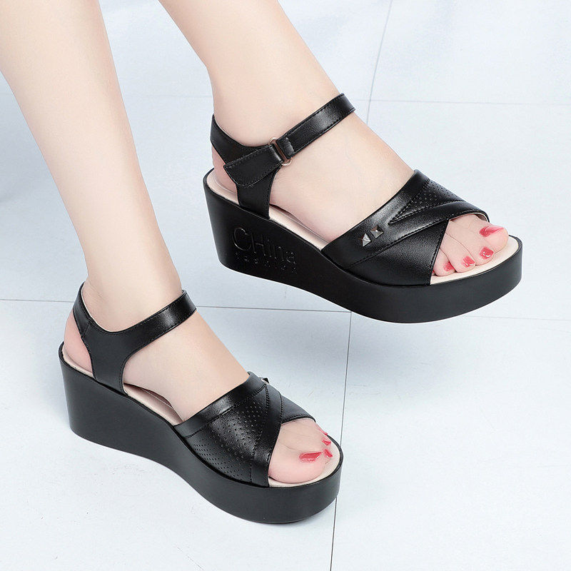意尔康2026夏季坡跟凉鞋跟鞋鱼嘴鞋厚底防滑妈妈鞋软底黑色露趾