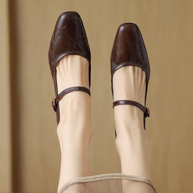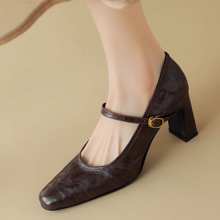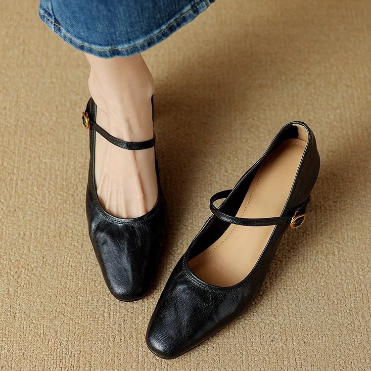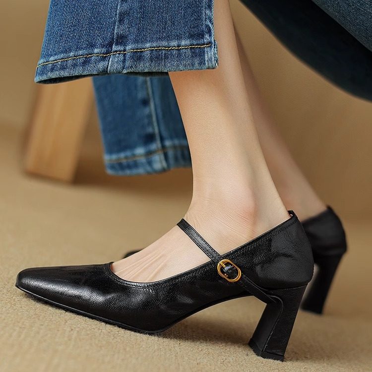 复古高跟女鞋春季新款羊皮一字扣带粗跟黑色法式真皮玛丽珍单鞋