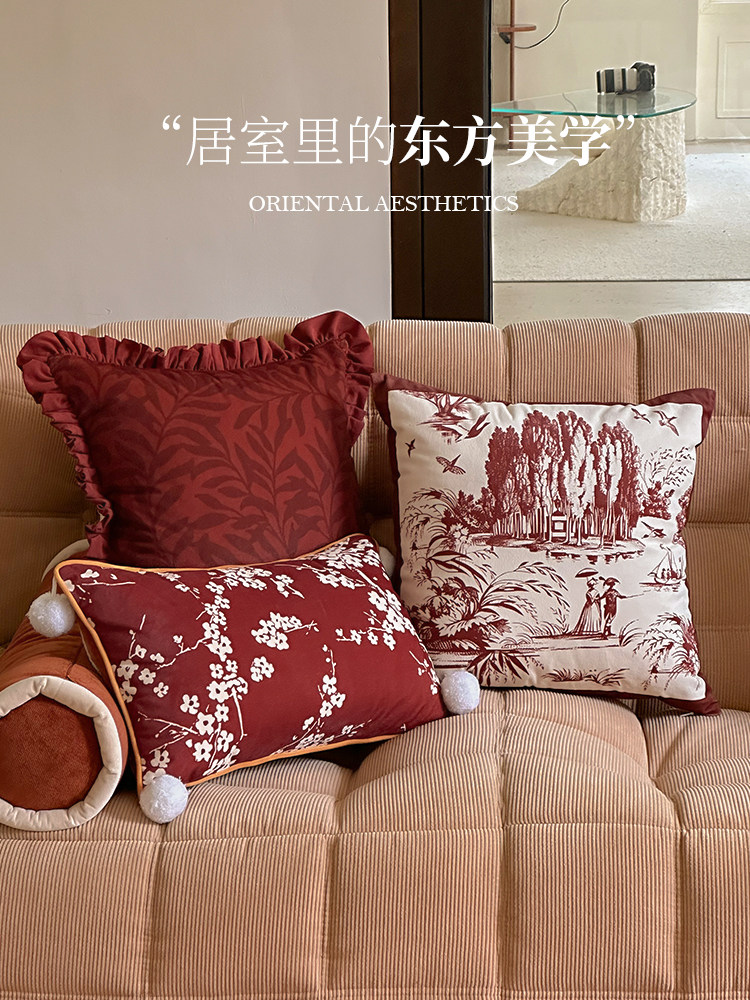 【孤品4折】蜡笔派梅韵芳华抱枕轻奢复古红色沙发靠垫新婚礼物枕O