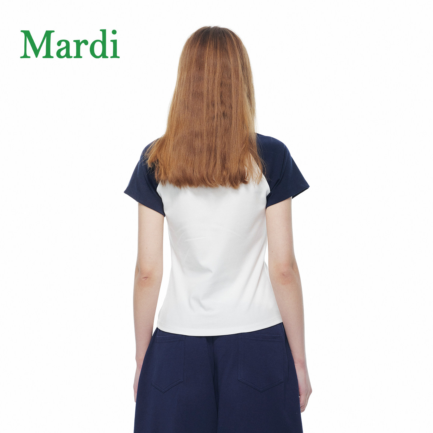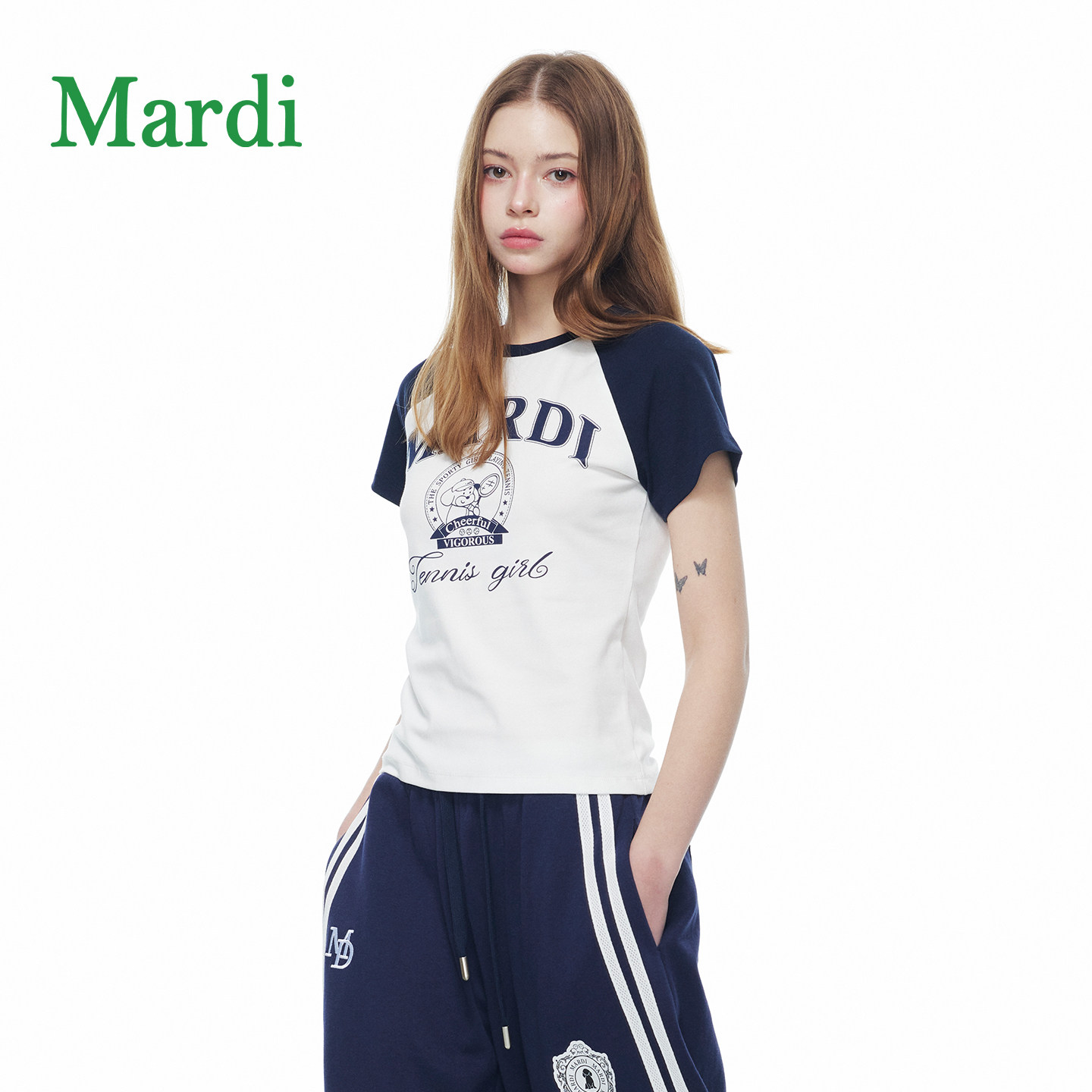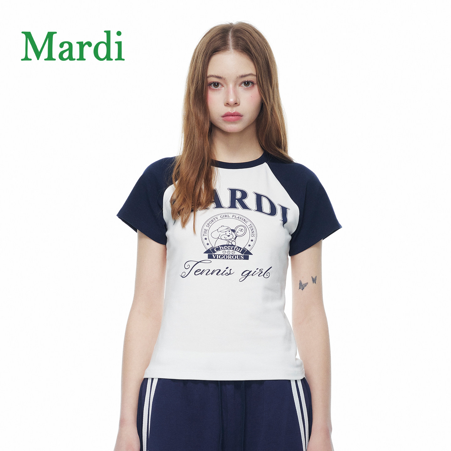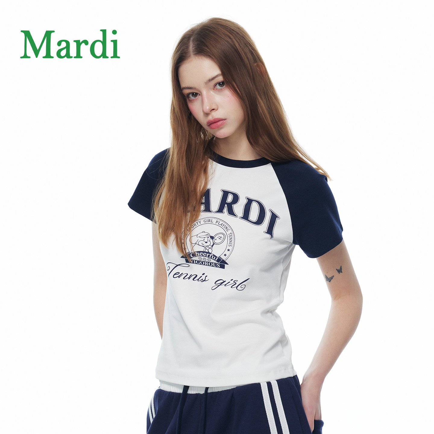 MARDI撞色字母印花短袖T恤女简约运动风个性上衣插肩袖藤蓝少女
