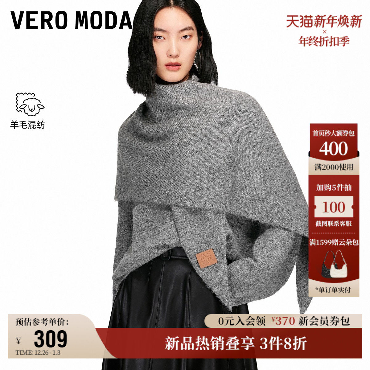 Vero Moda奥莱针织衫女2025秋冬新款含绵羊毛可拆披肩上衣气质