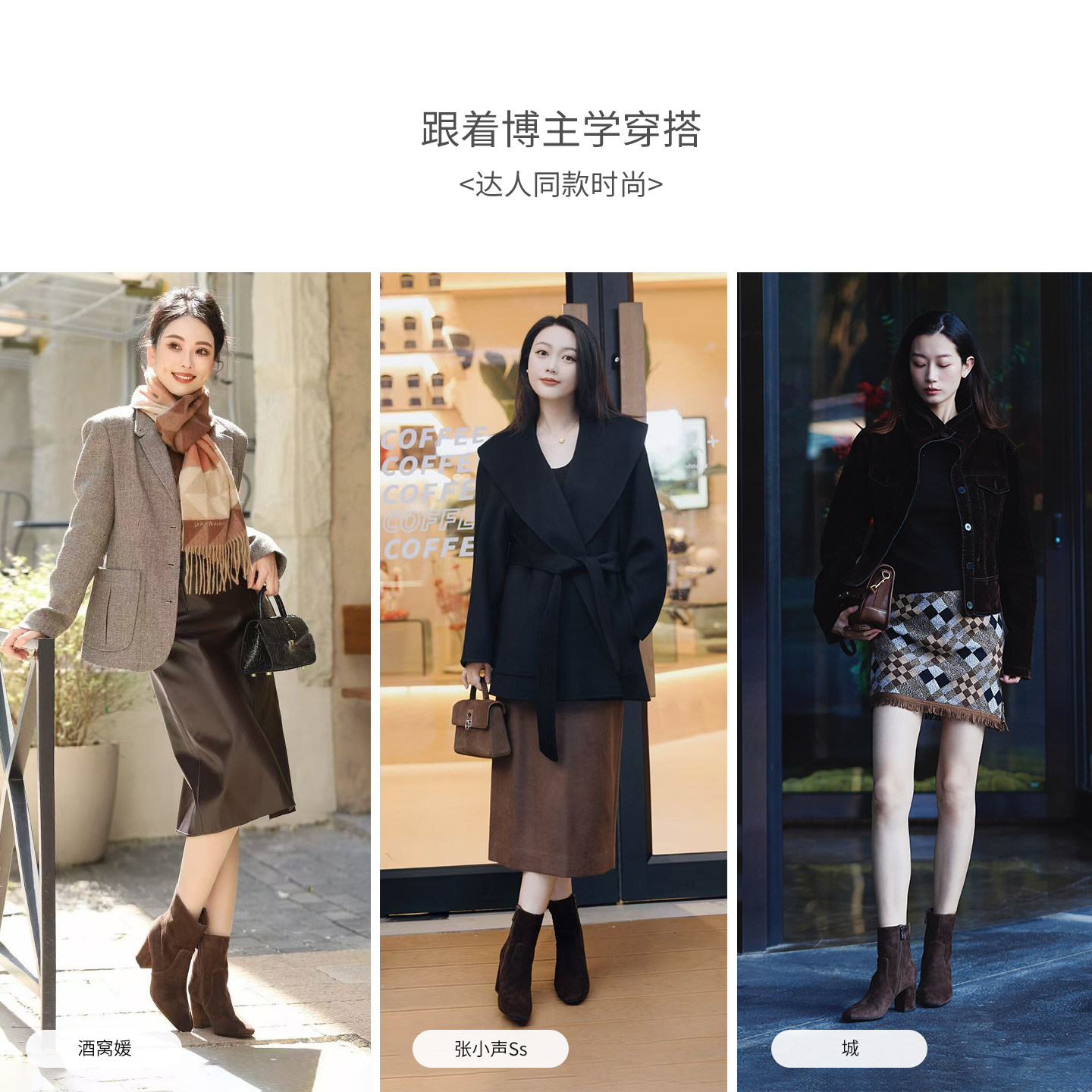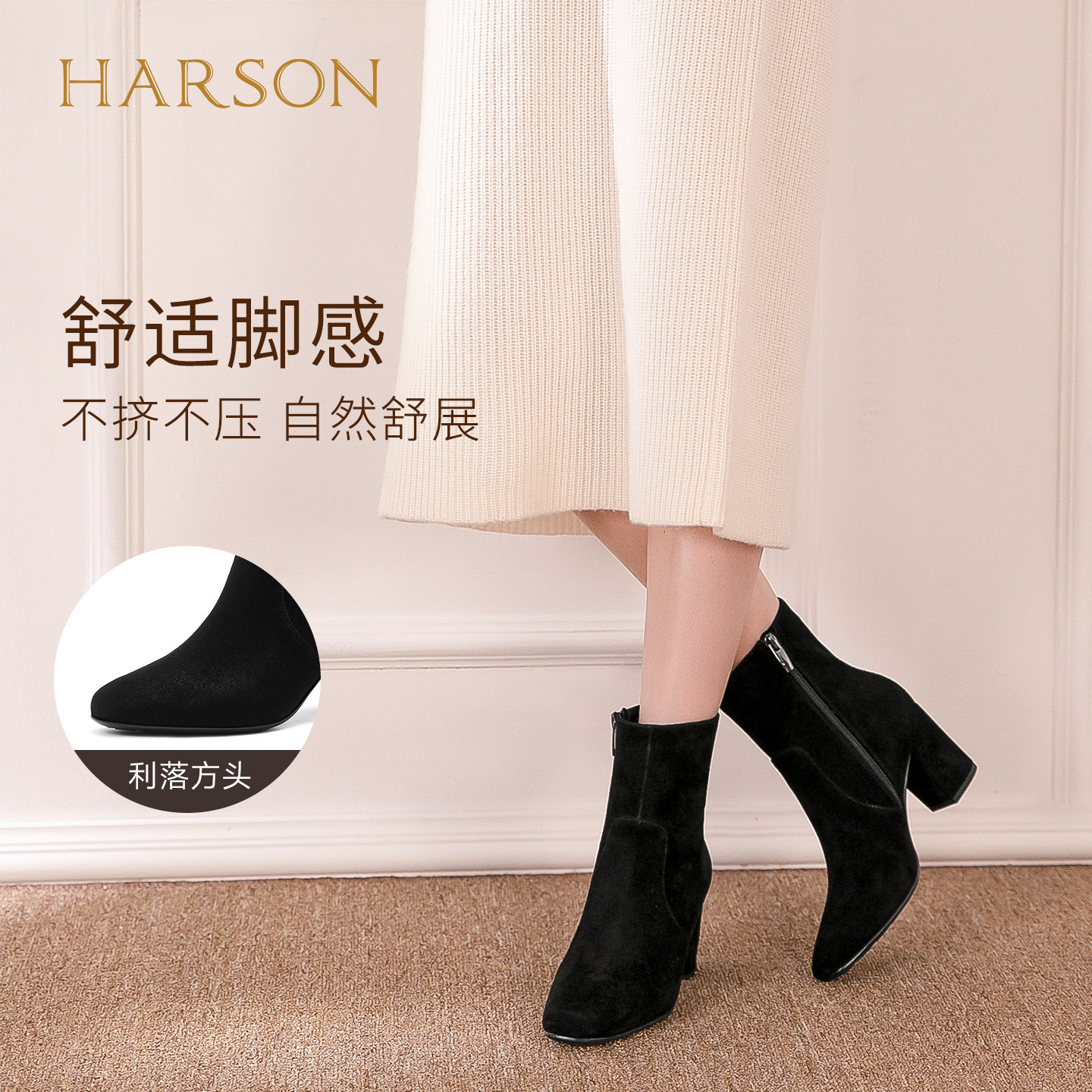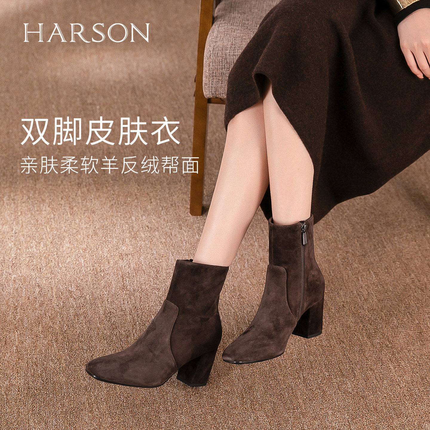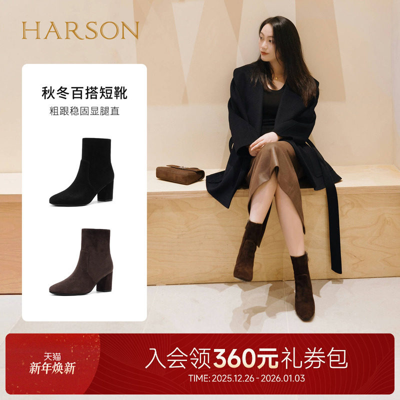 哈森/HARSON【弹力塑形家】25冬新款气质绒面粗高跟时装短靴女