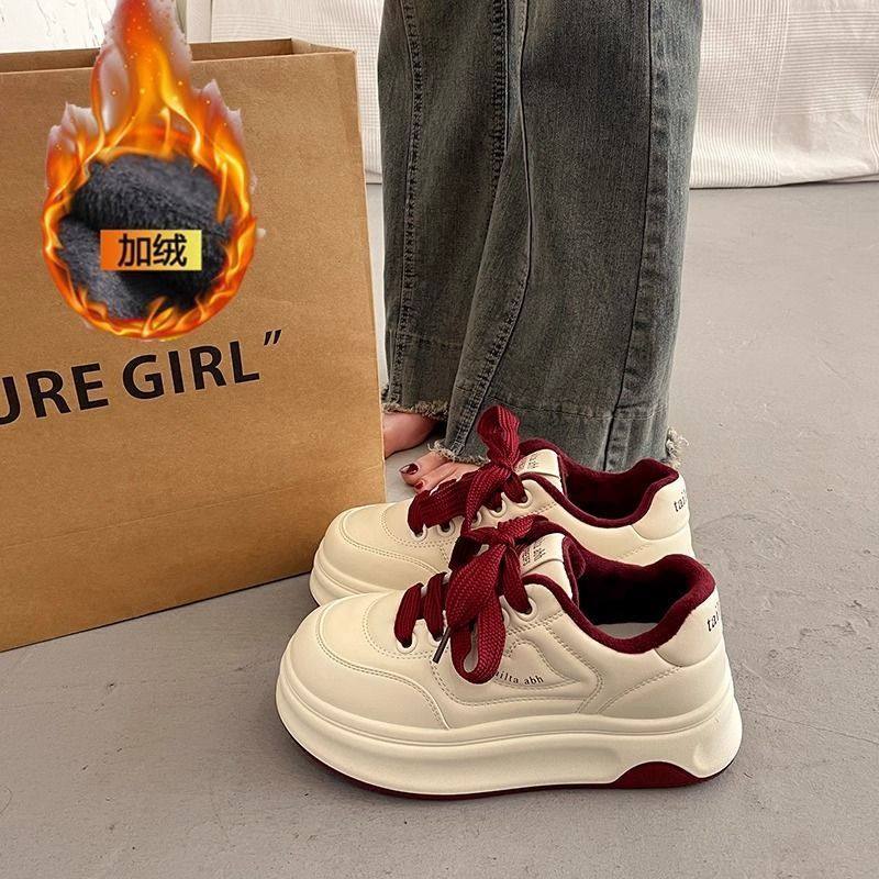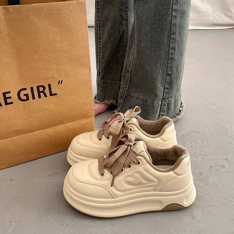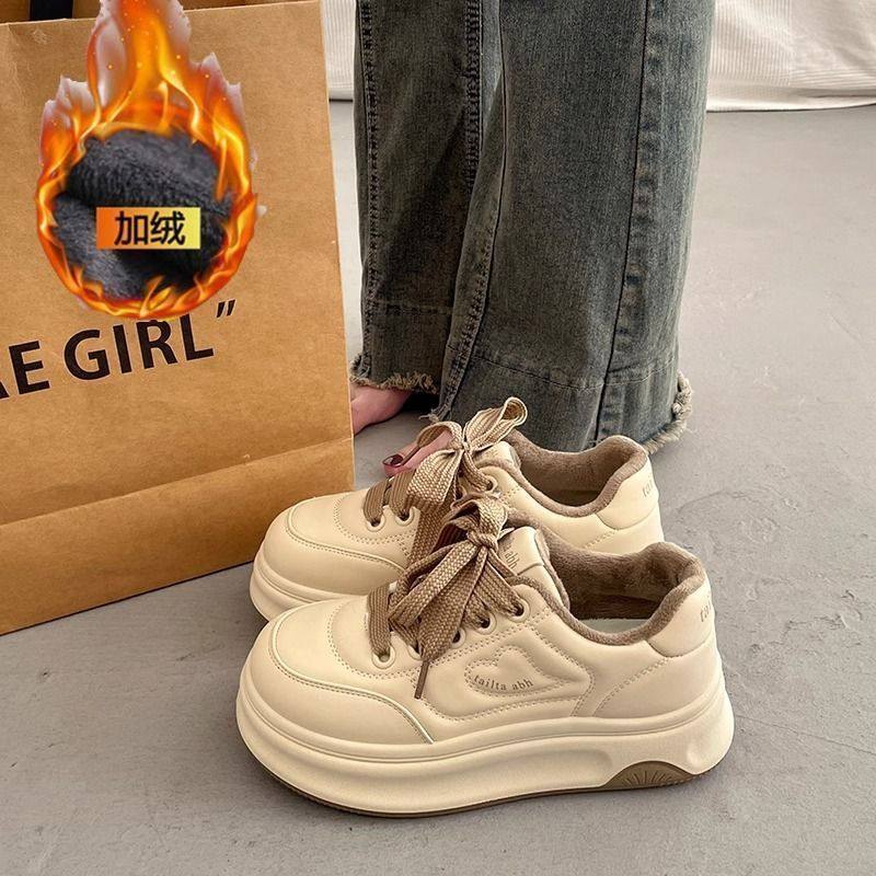 运动鞋厚底休闲板鞋女2025秋冬女款新款米色加绒女鞋内增高德训鞋