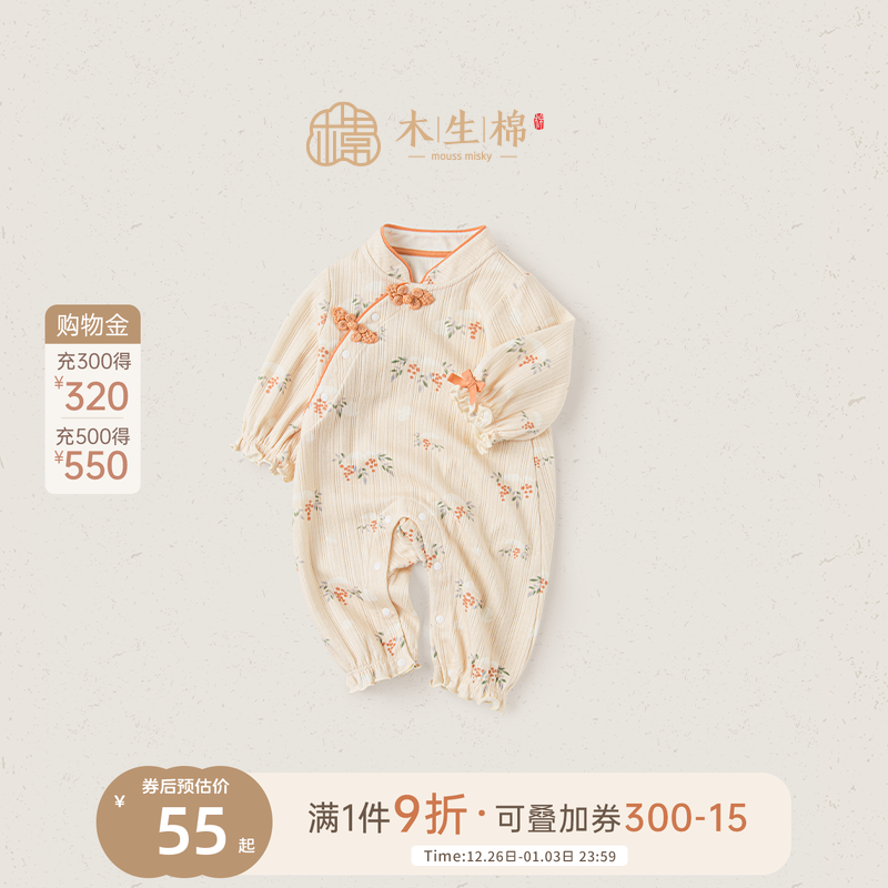 木生棉女宝宝纯棉连体衣春秋季中式国风婴儿哈衣爬服外出周岁礼服