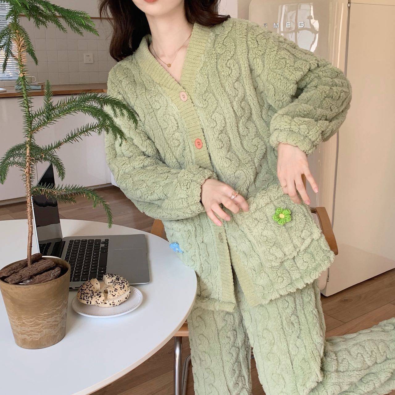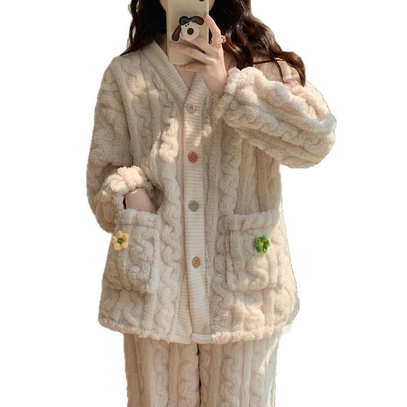 开衫套装秋冬加绒加厚女士家居服珊瑚绒提花暖暖毛绒睡衣A105