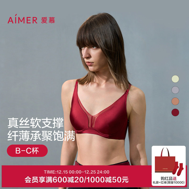 爱慕真丝文胸秋冬本命年红色内衣女软钢圈薄杯大胸显小性感胸罩