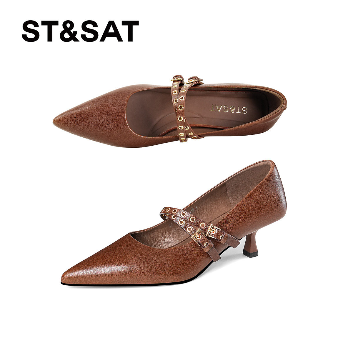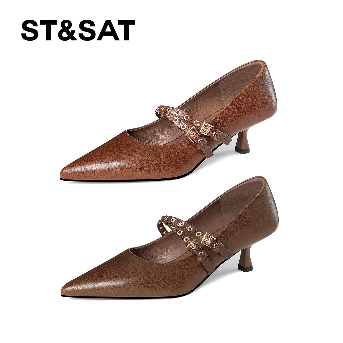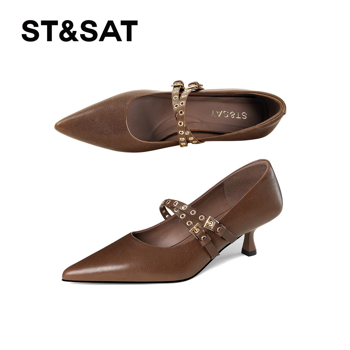 星期六棕色玛丽珍鞋女2025尖头浅口单鞋一字带铆钉气质细跟高跟鞋