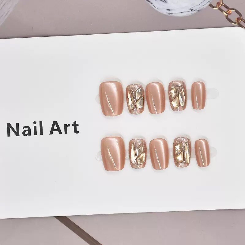 秋冬奶茶棕猫眼爆闪香槟钻穿戴美甲贴成品手工光疗美甲小红书爆款