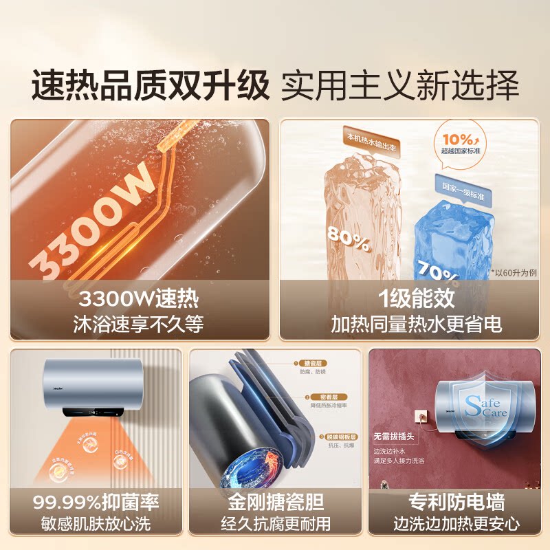 海尔统帅电热水器家用卫生间洗澡家用储水式60L3.3KW变频速热