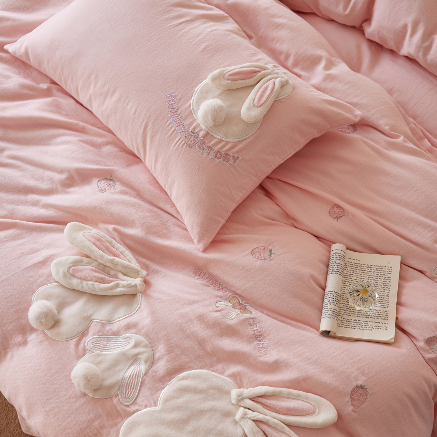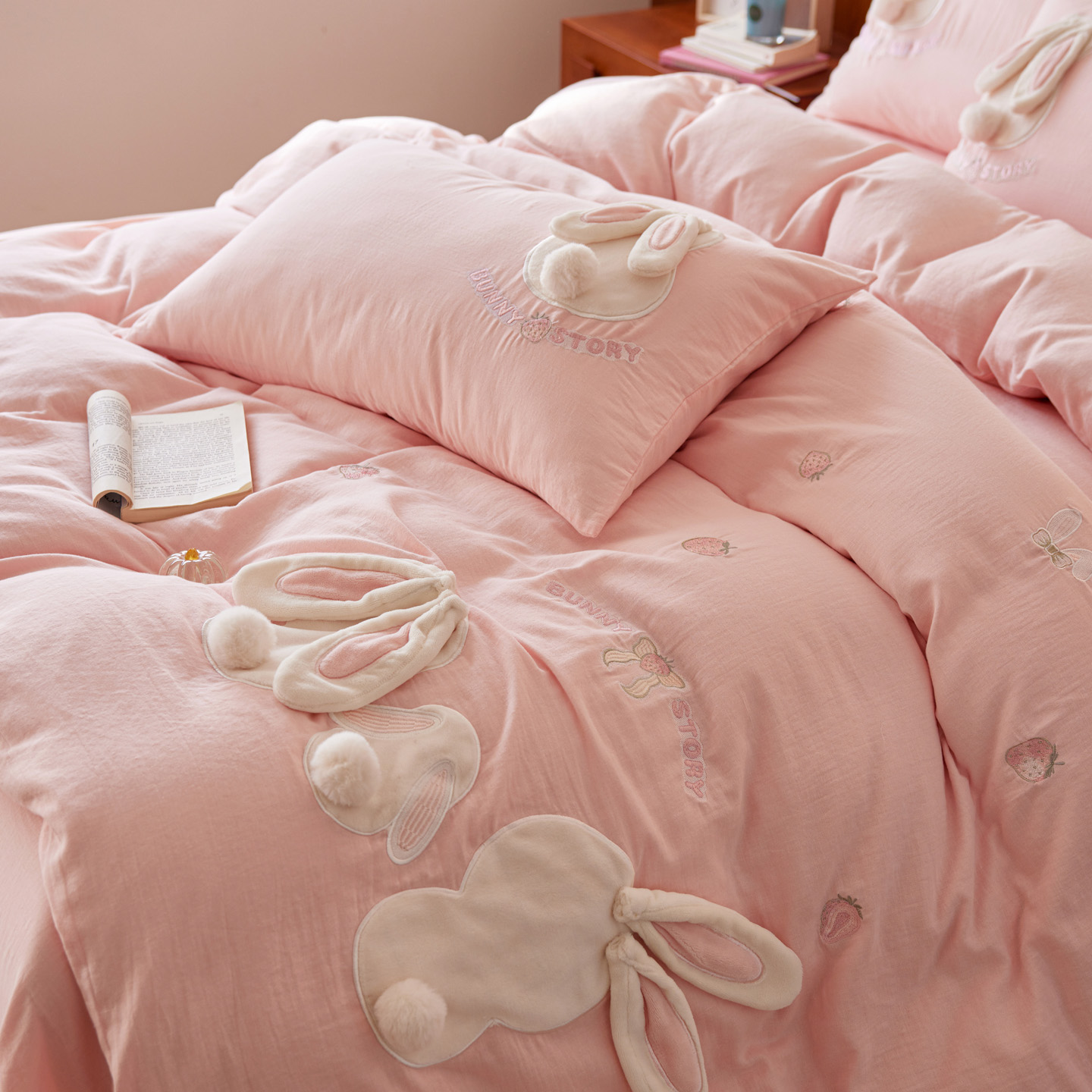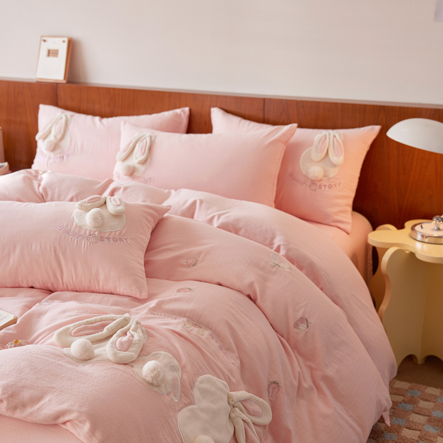 四件套2025新款A类全棉水洗双层纱草莓兔系列