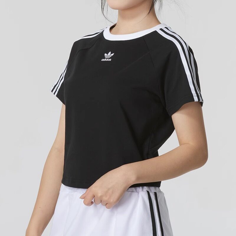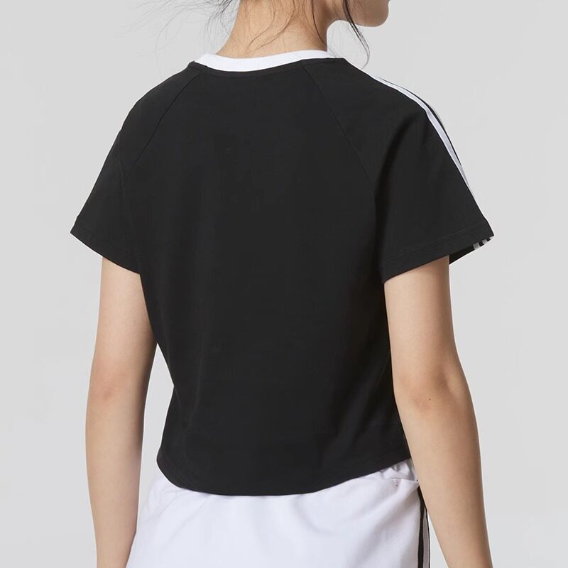 阿迪达斯三叶草女子Jennie同款三条纹短款高腰短袖T恤黑色 JC8703