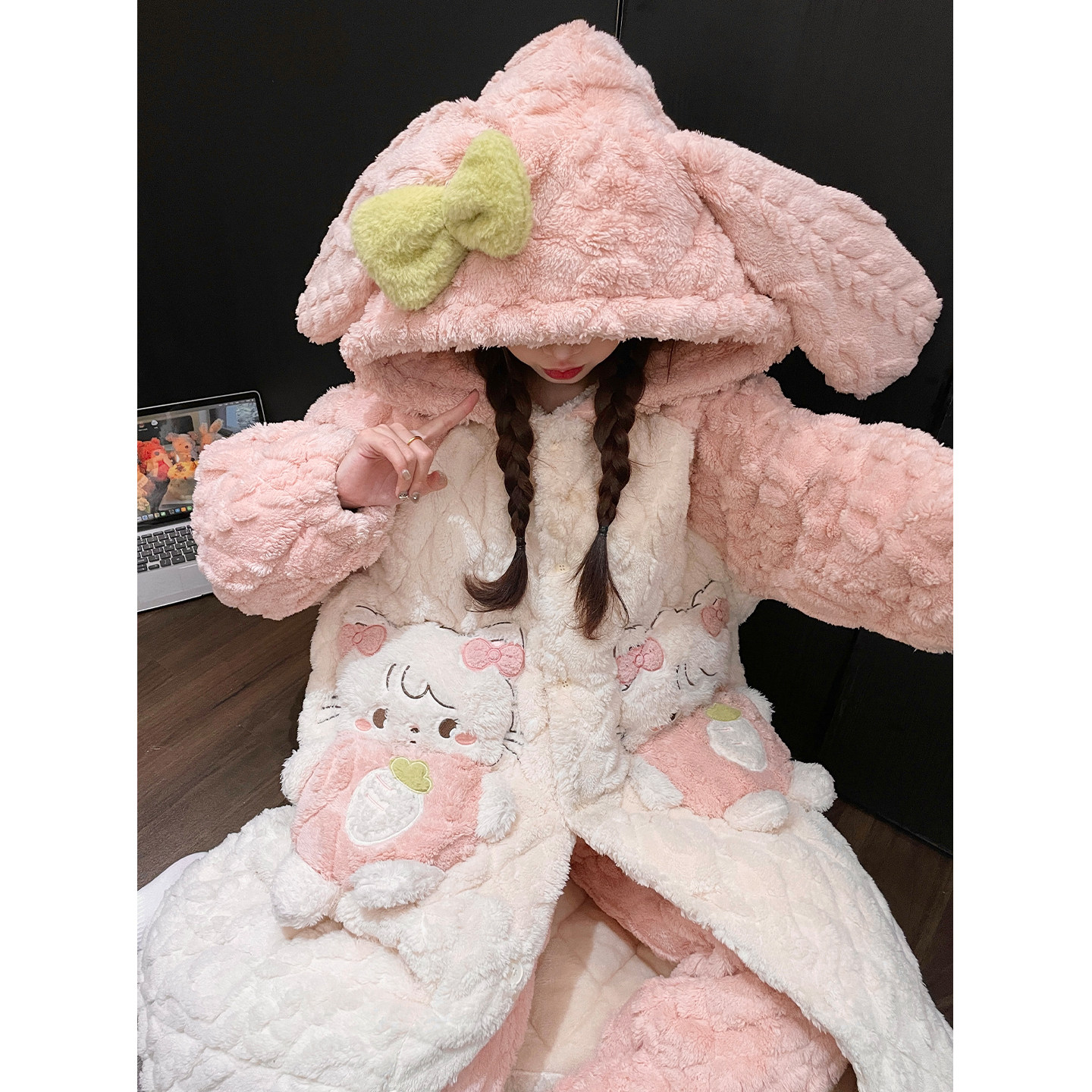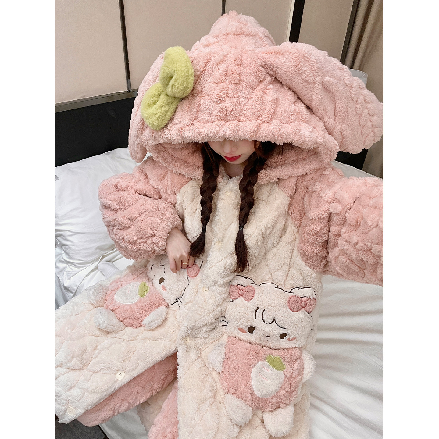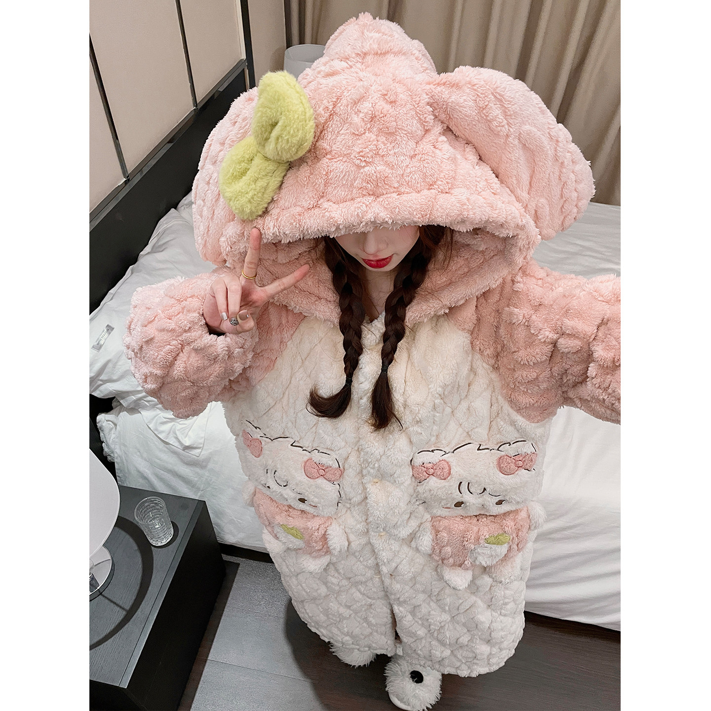 yso【酷猫系列】睡衣女秋冬新款毛绒长款连帽加厚保暖开衫睡袍D