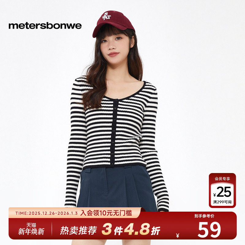美特斯邦威潮流毛衣女款秋季时尚撞色条纹修身长袖开衫甜美上衣