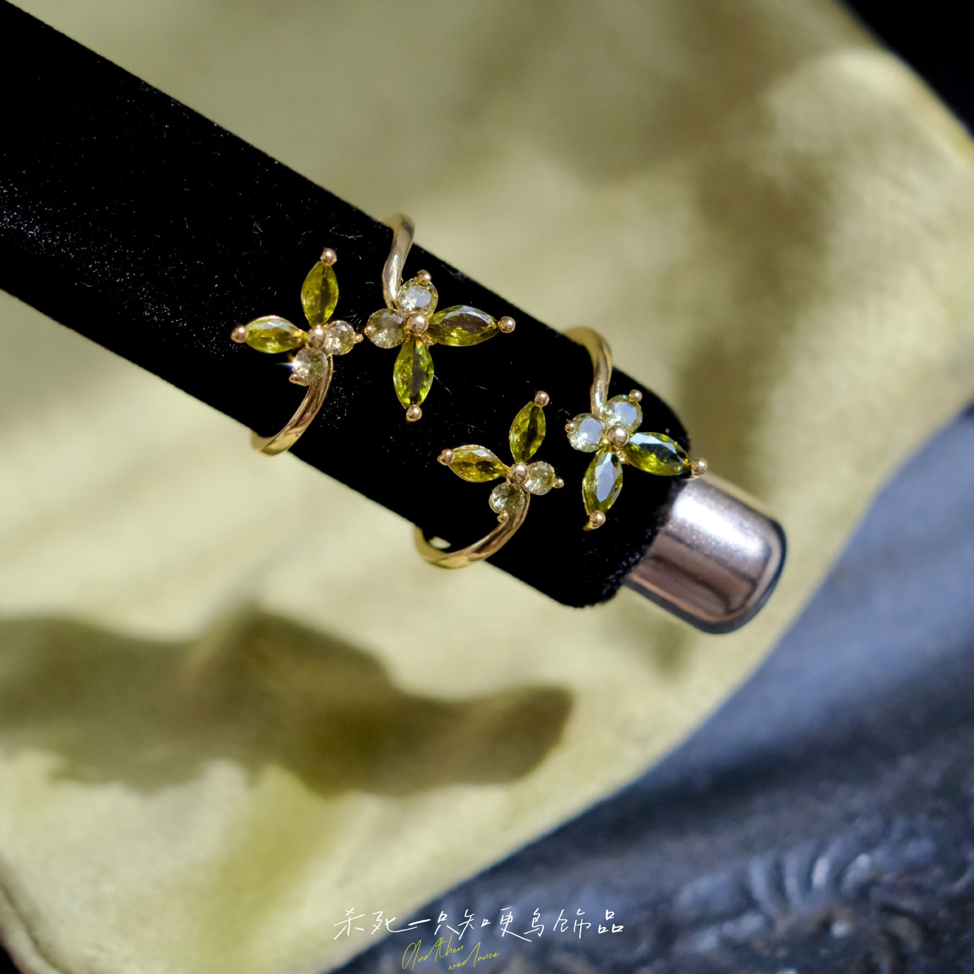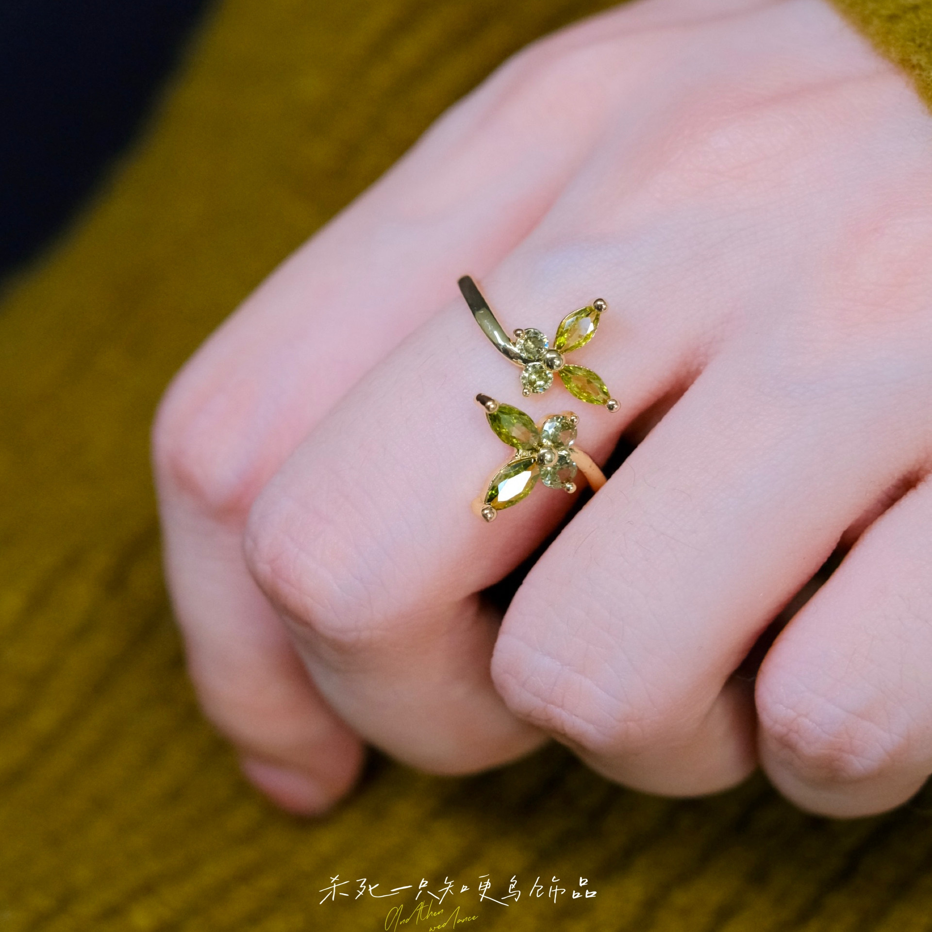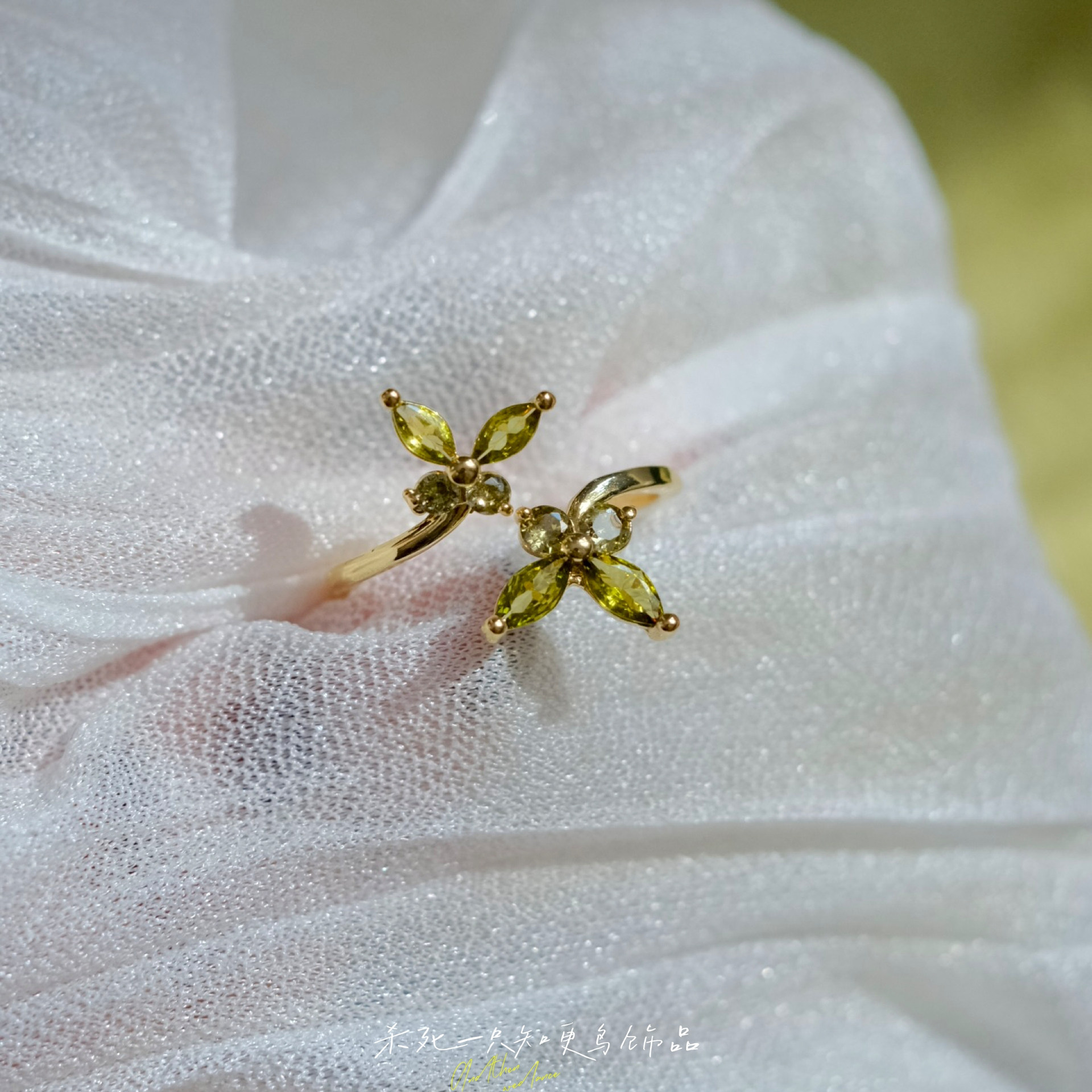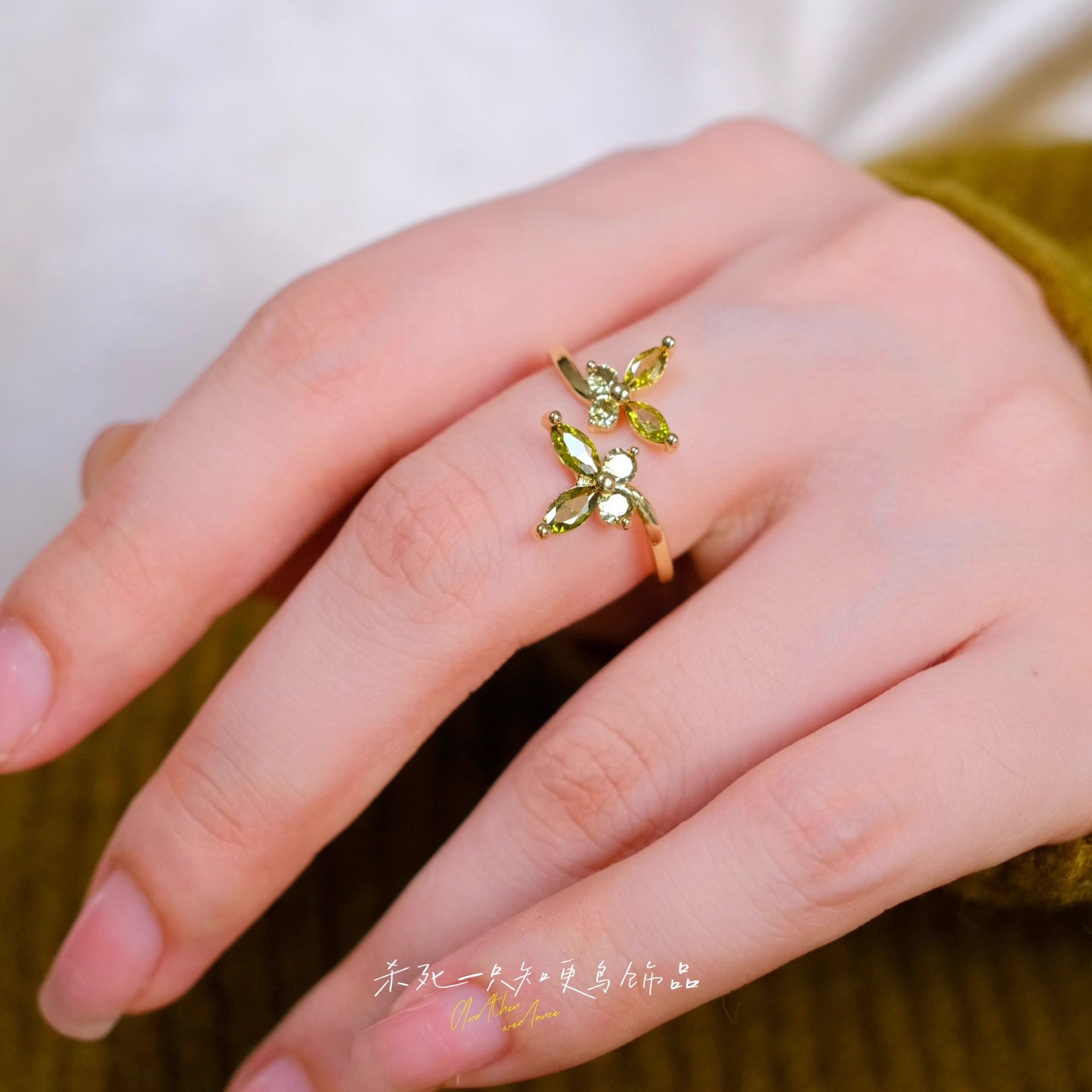 《精灵花语》法式复古清新精致橄榄绿锆石花朵戒指开口可调节指环