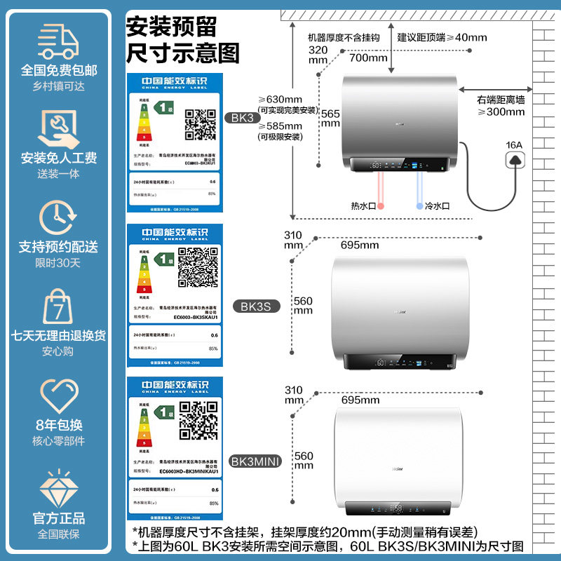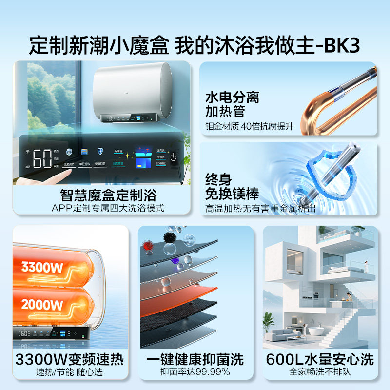 海尔小红花电热水器扁桶双胆家用一级魔盒官方BK3S/BK3/BK3MINI