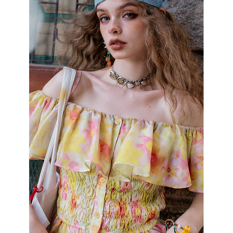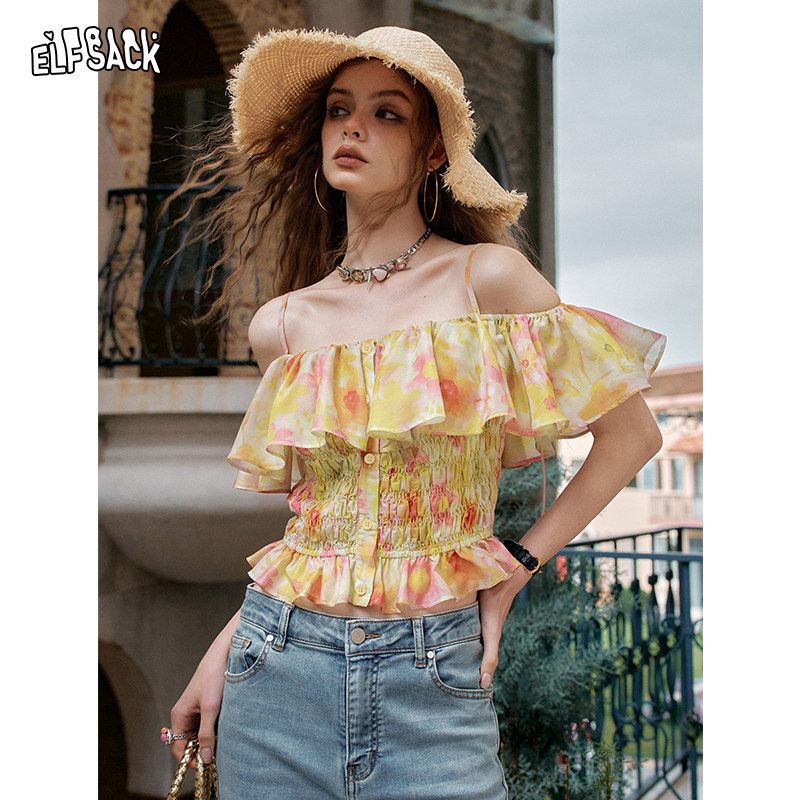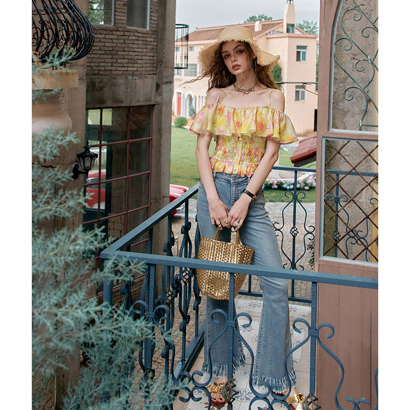 妖精的口袋碎花修身一字肩雪纺衫女2025年夏季新款绝美吊带小衫