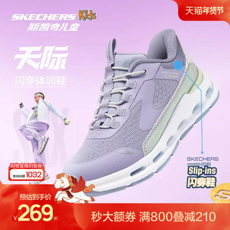 Skechers斯凯奇儿童天际闪穿鞋春季女童轻便防滑运动鞋一脚蹬跑鞋