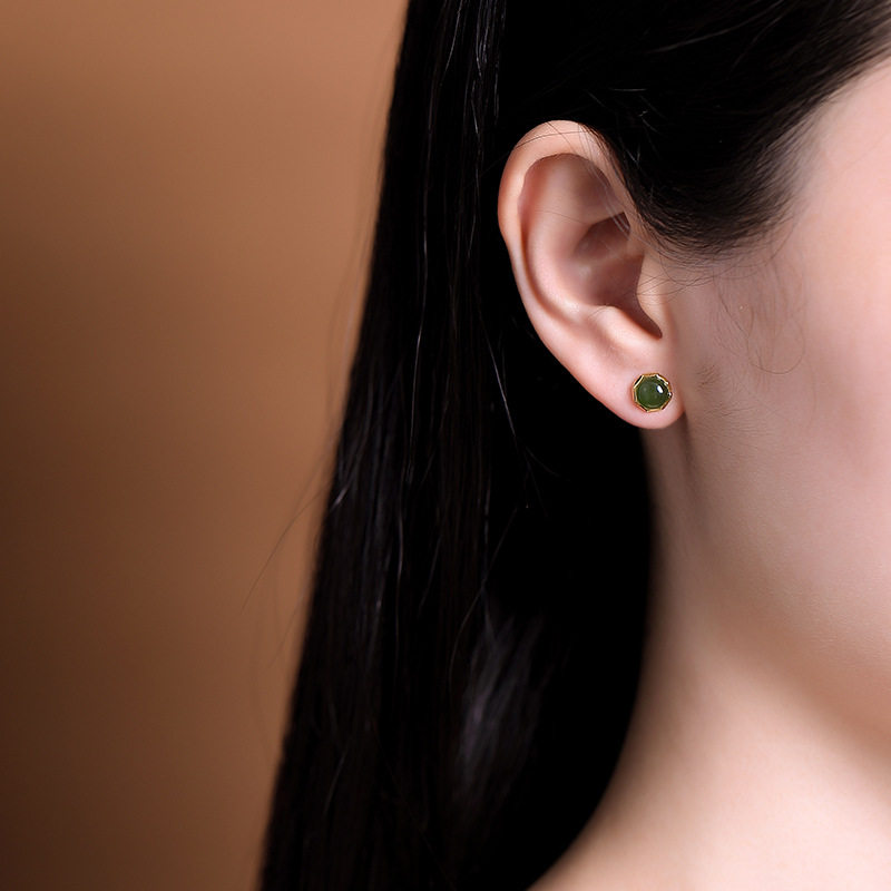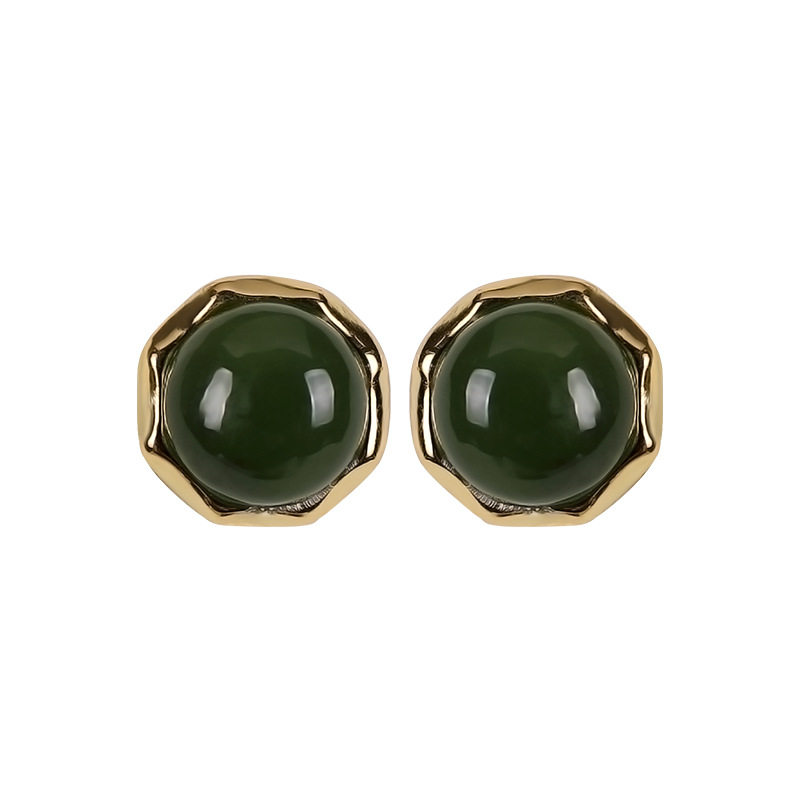 壹鹿银S925纯银镀金和田玉碧玉圆珠复古个性简约气质女士耳钉耳饰