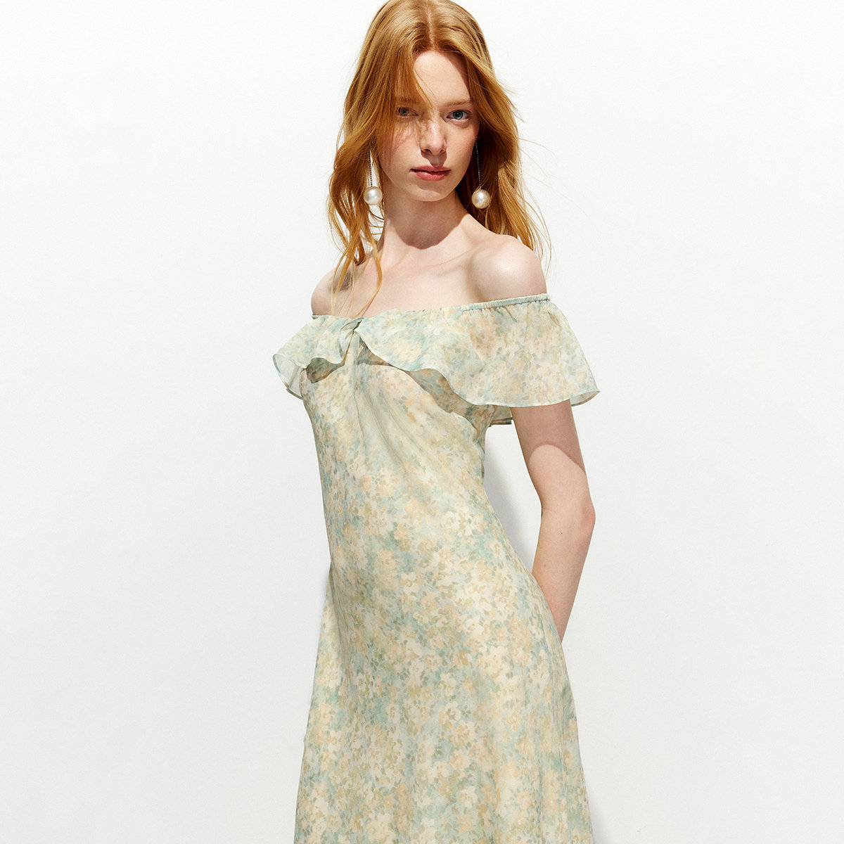 雨菲2025夏新款碎花v领飞飞边清冷大美人设计感显瘦斜裁连衣裙女