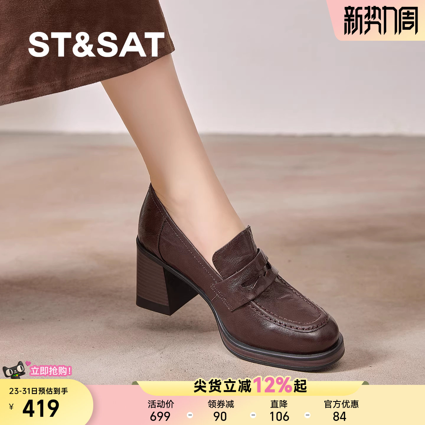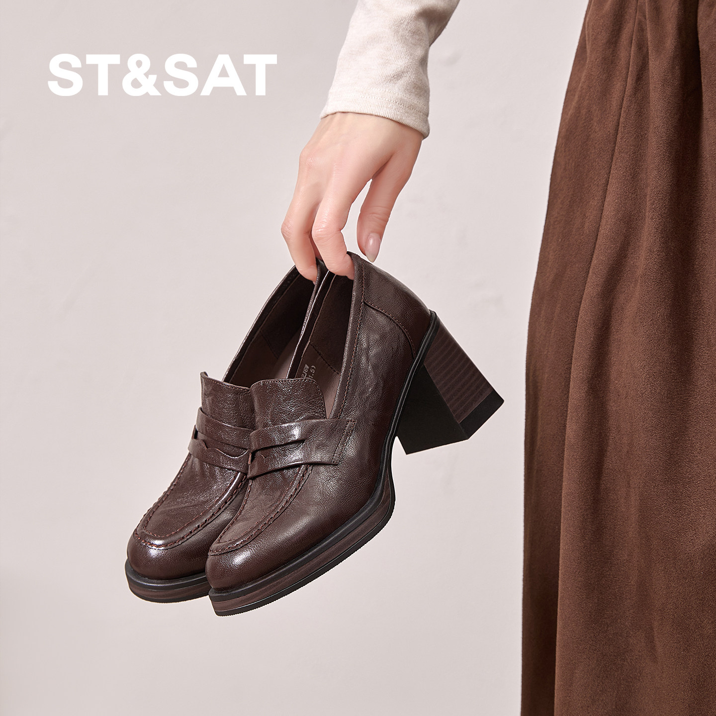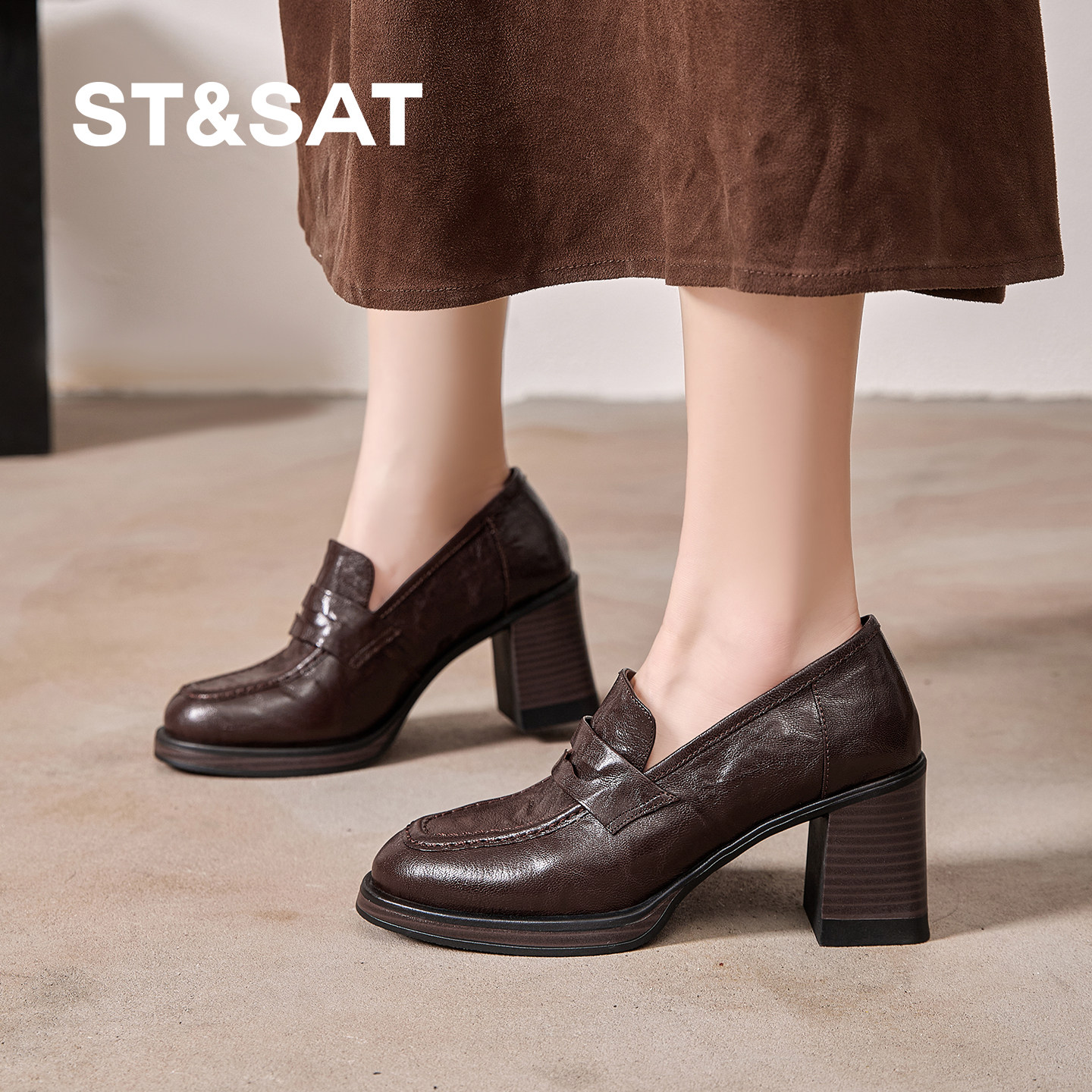 星期六英伦风真皮乐福鞋女粗跟通勤小皮鞋小个子不累脚高跟鞋