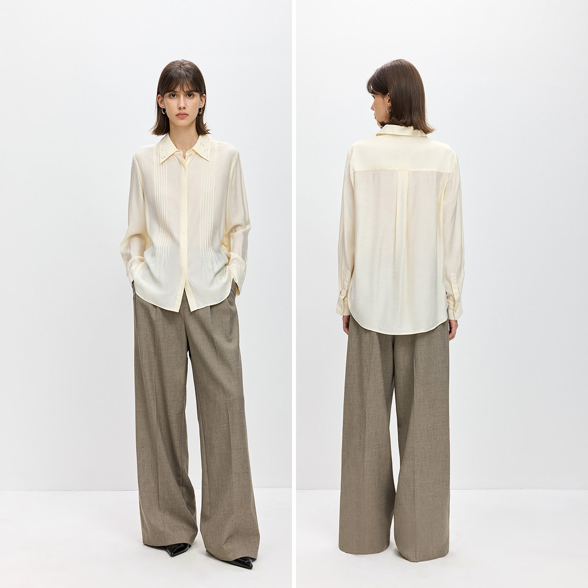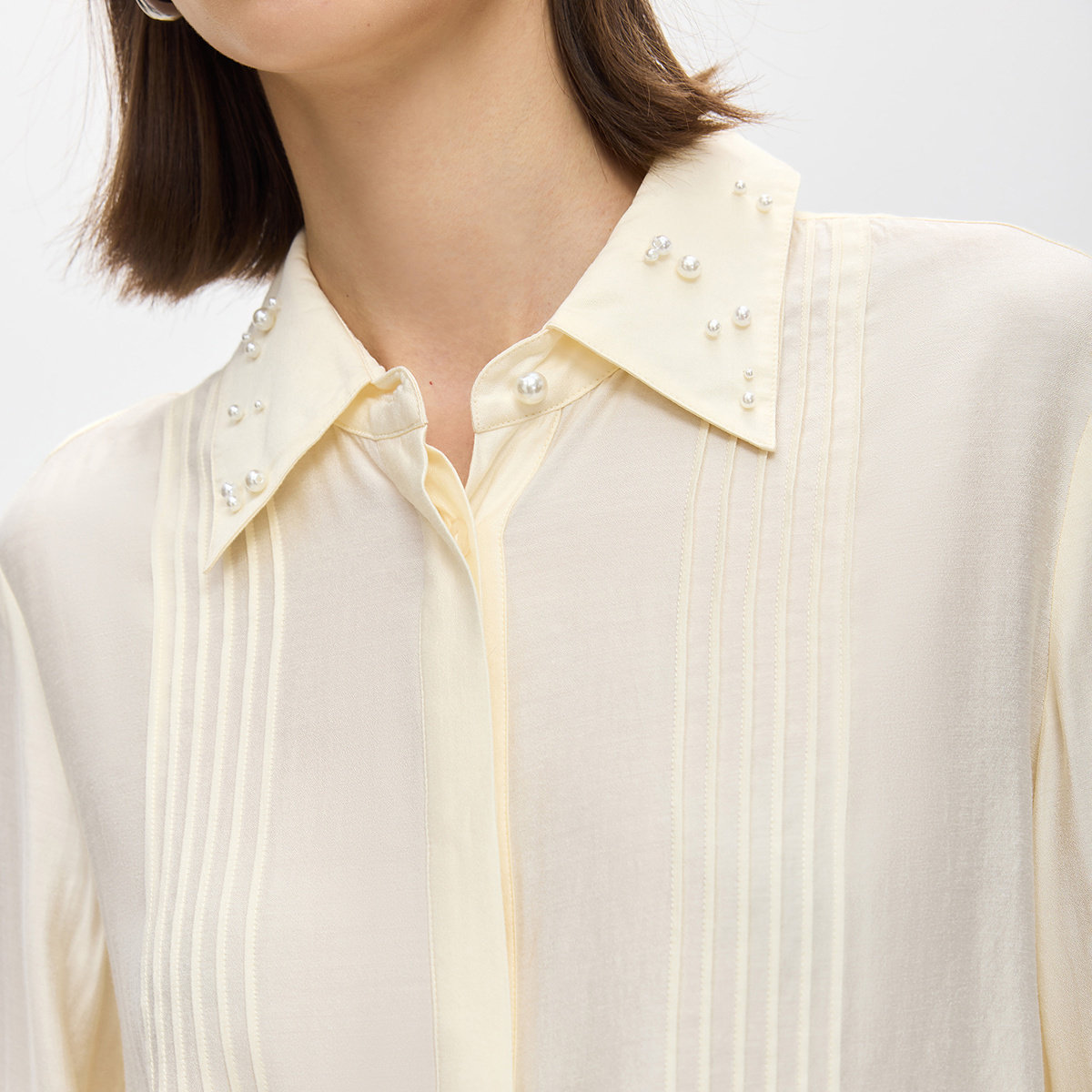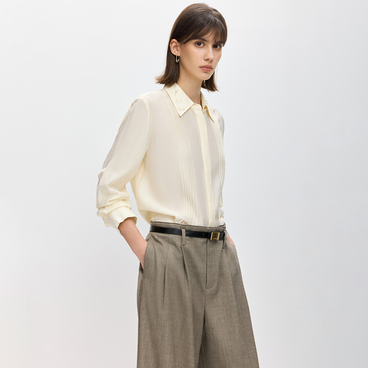 LILY2026春新款女装法式简约翻领钉珠气质通勤奶白色长袖衬衫外套