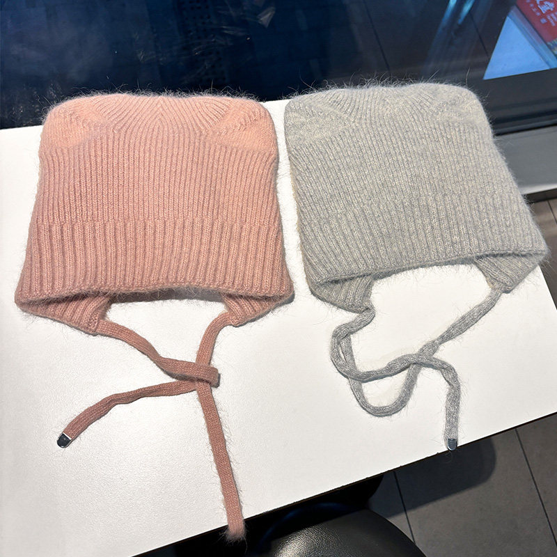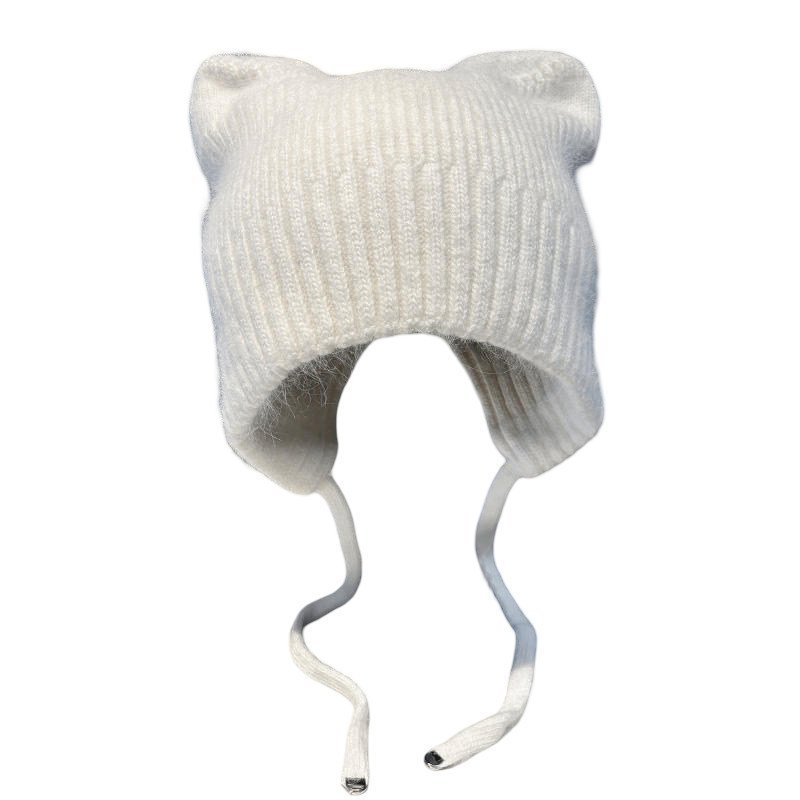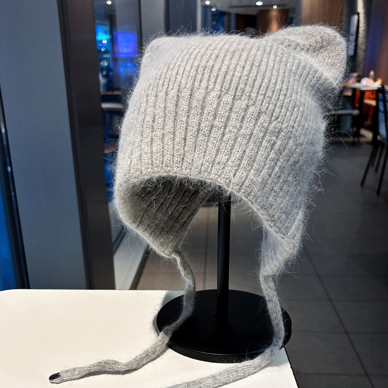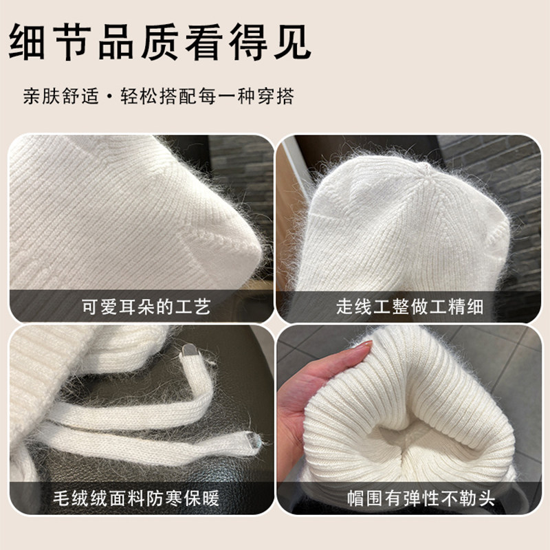可爱耳朵系带针织帽子女款2025新款冬季滑雪防风保暖护耳兔毛线帽