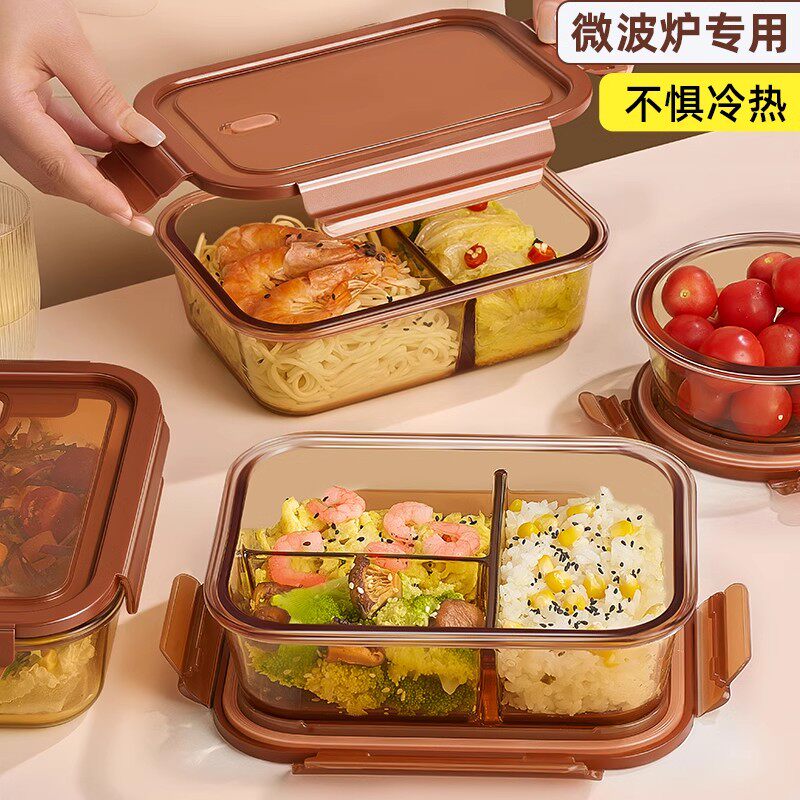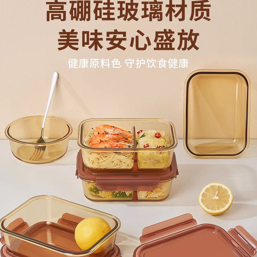 新款琥珀色玻璃保鲜盒食品级耐高温可微波炉加热带饭上班族饭盒