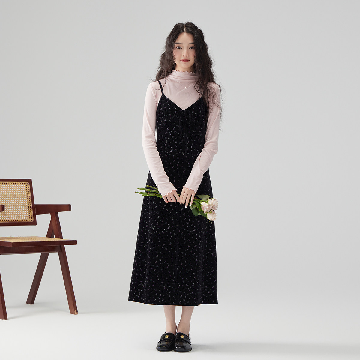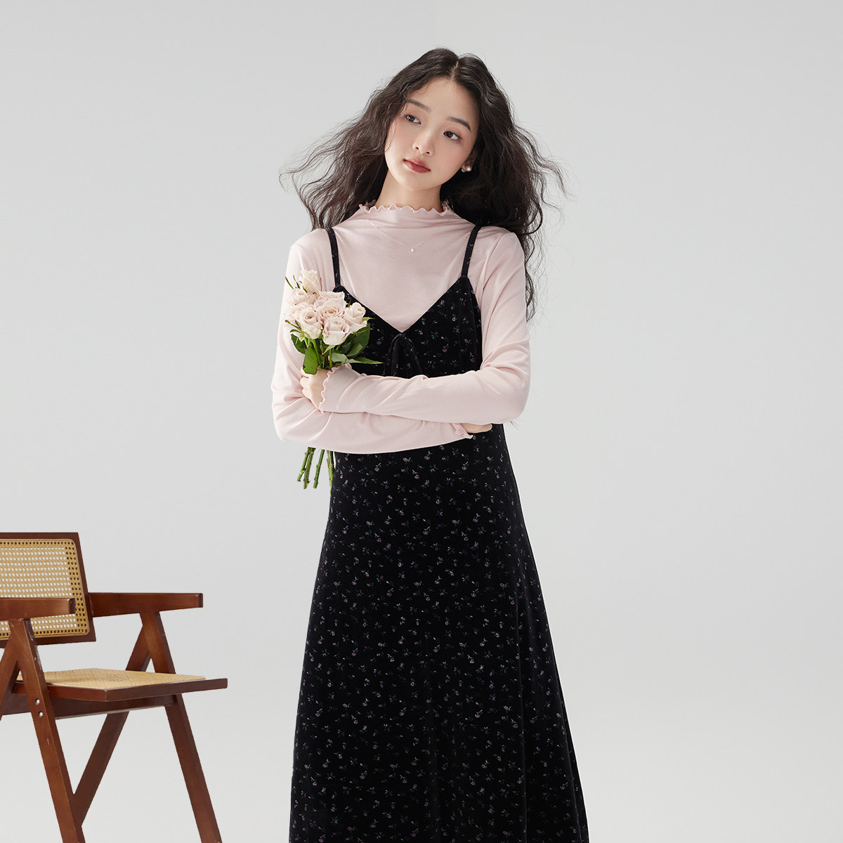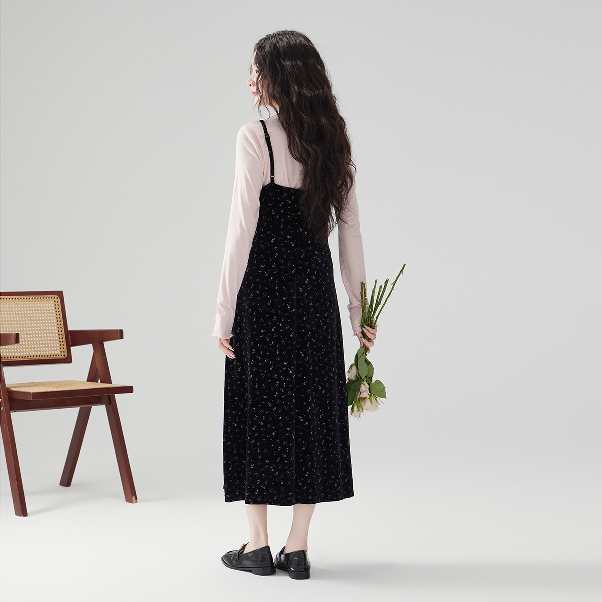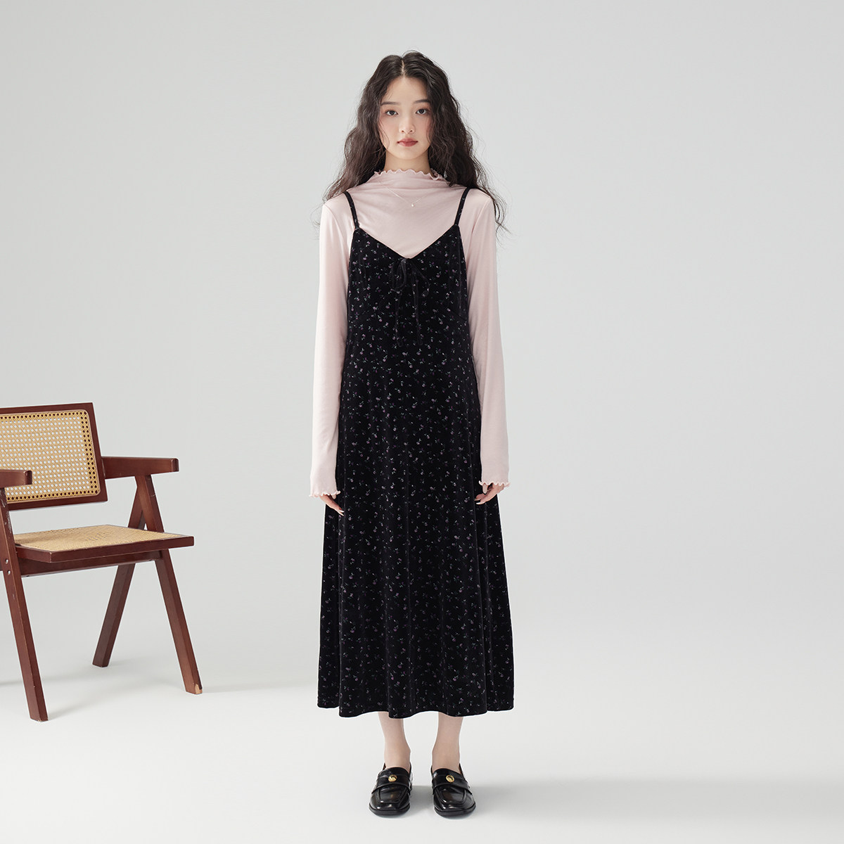 法式丝绒连衣裙女高级感A字裙2025春秋印花吊带裙外穿背带裙