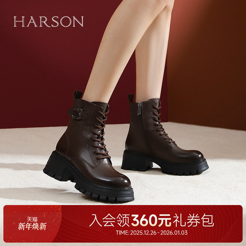哈森英伦风潮酷8孔马丁靴秋冬新款褶皱机车女靴单靴HA244101