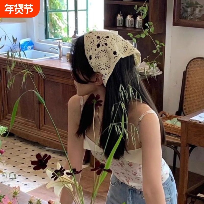 头巾三角巾针织女田园风2025新款法式头饰网红同款包头钩花发带