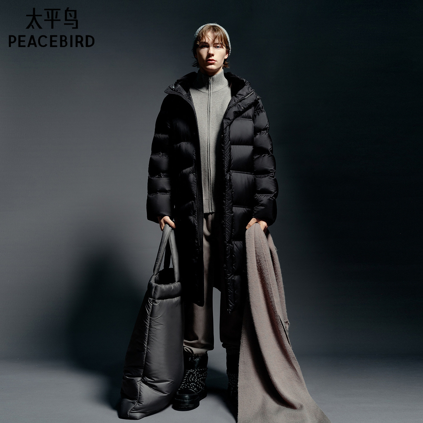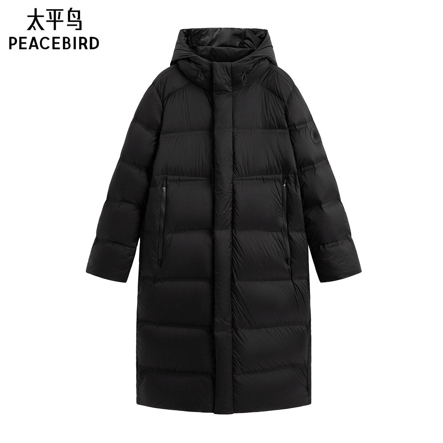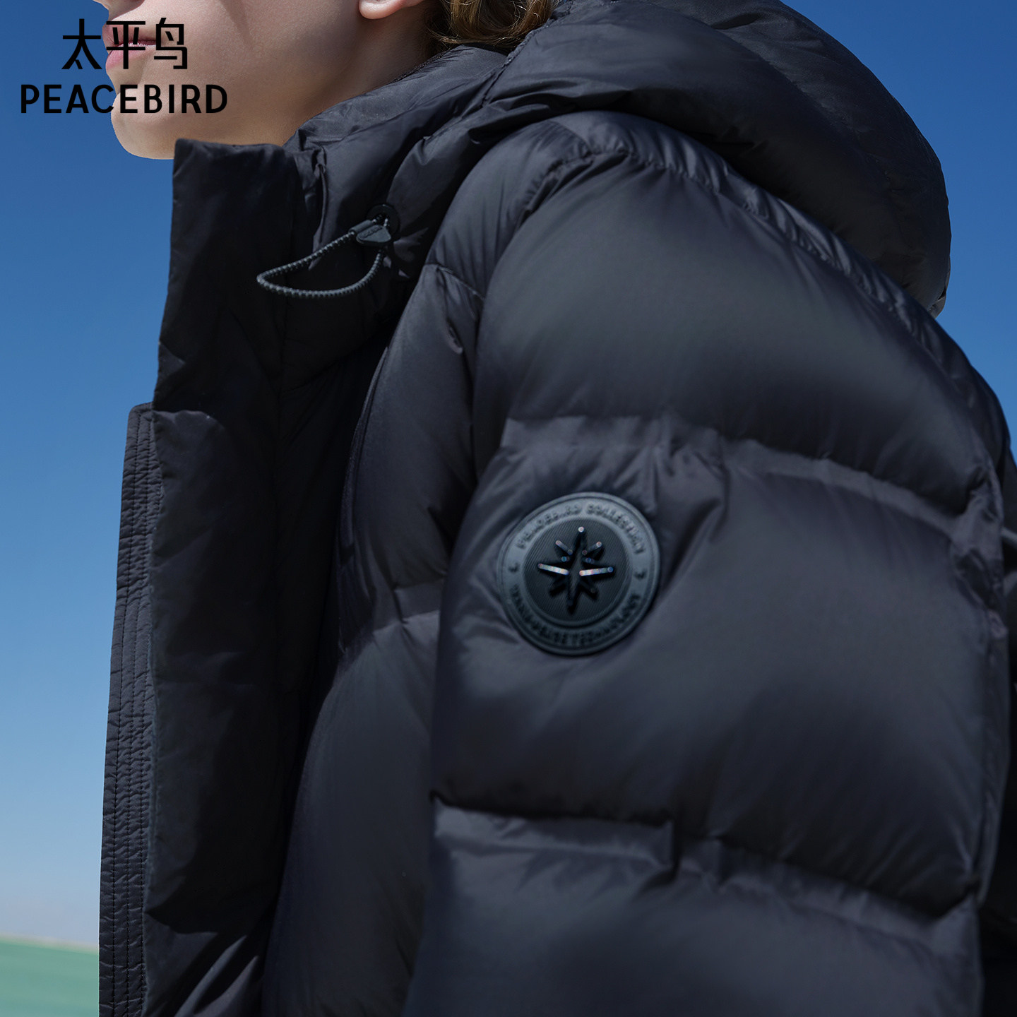 太平鸟男装 冬季羽绒服男宽松长款鹅绒户外工装黑色连帽防寒服