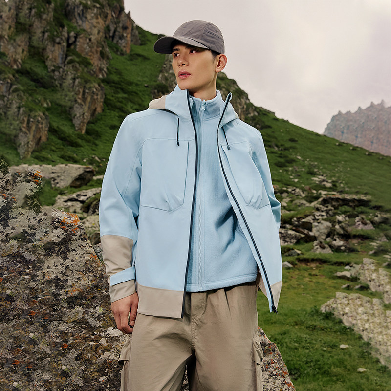 骆驼户外灰湛蓝冲锋衣男女款三合一可拆卸暴雨防水外套加厚登山服