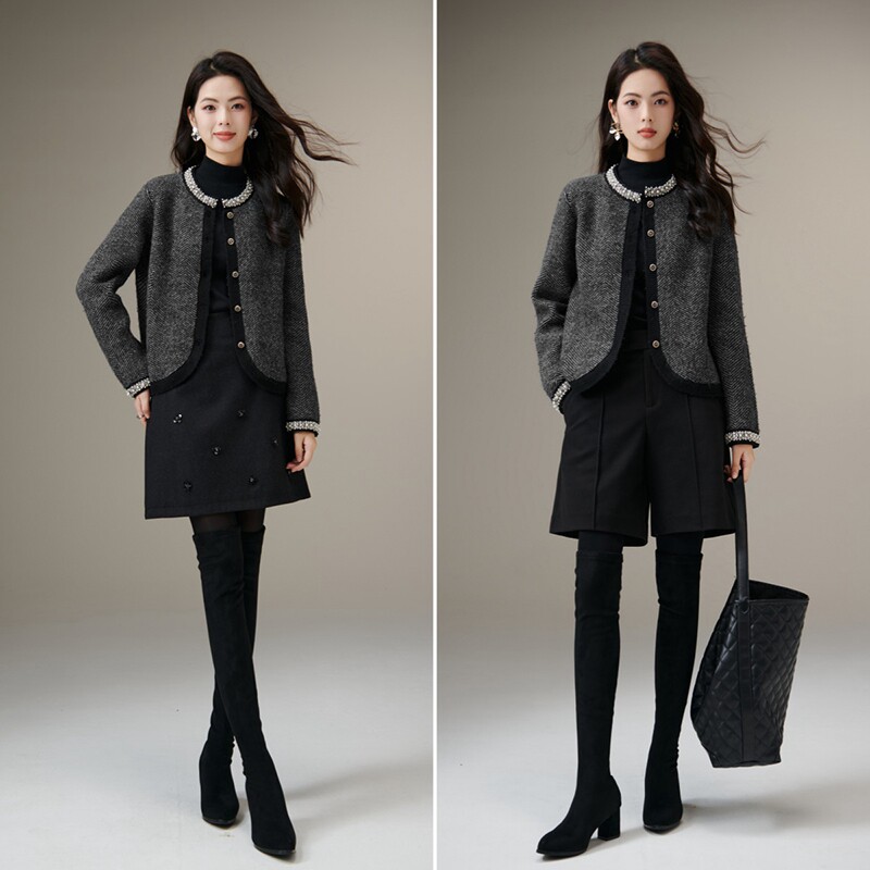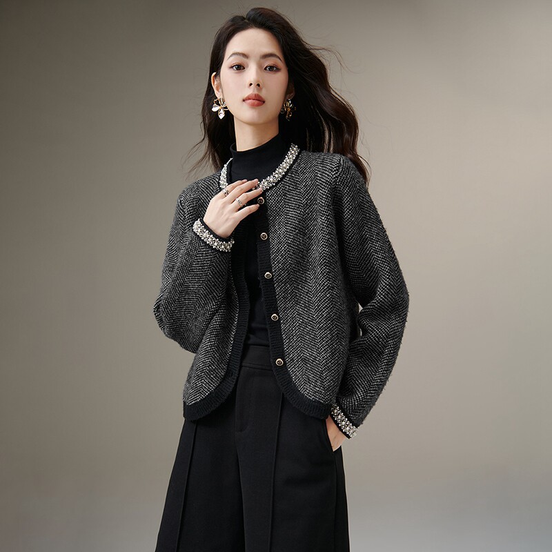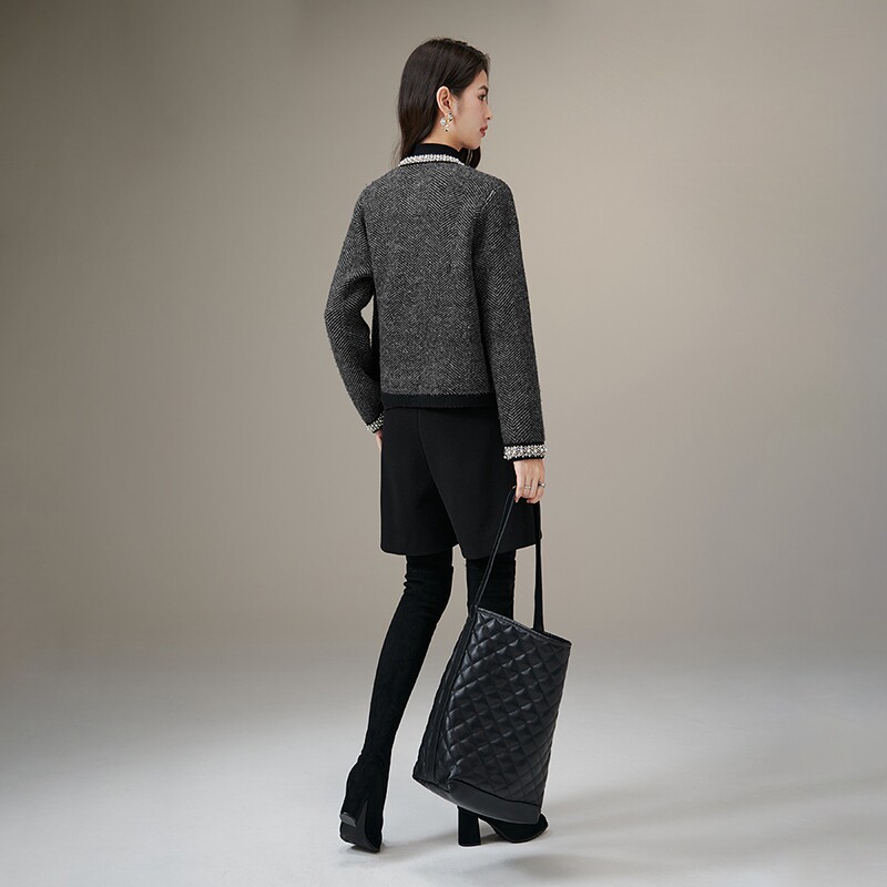 晚白2026年春新款时尚钉珠重要场合小香风上衣格雷灰气质羊毛外套