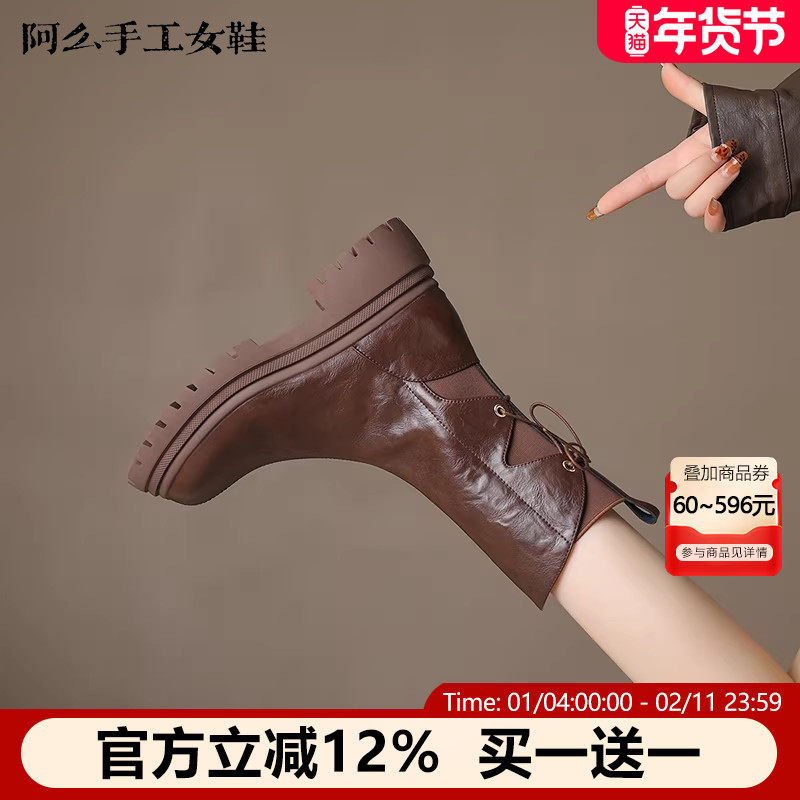 阿么手工女鞋真皮中筒靴时装靴秋冬新款厚底皮鞋圆头英伦风短靴女