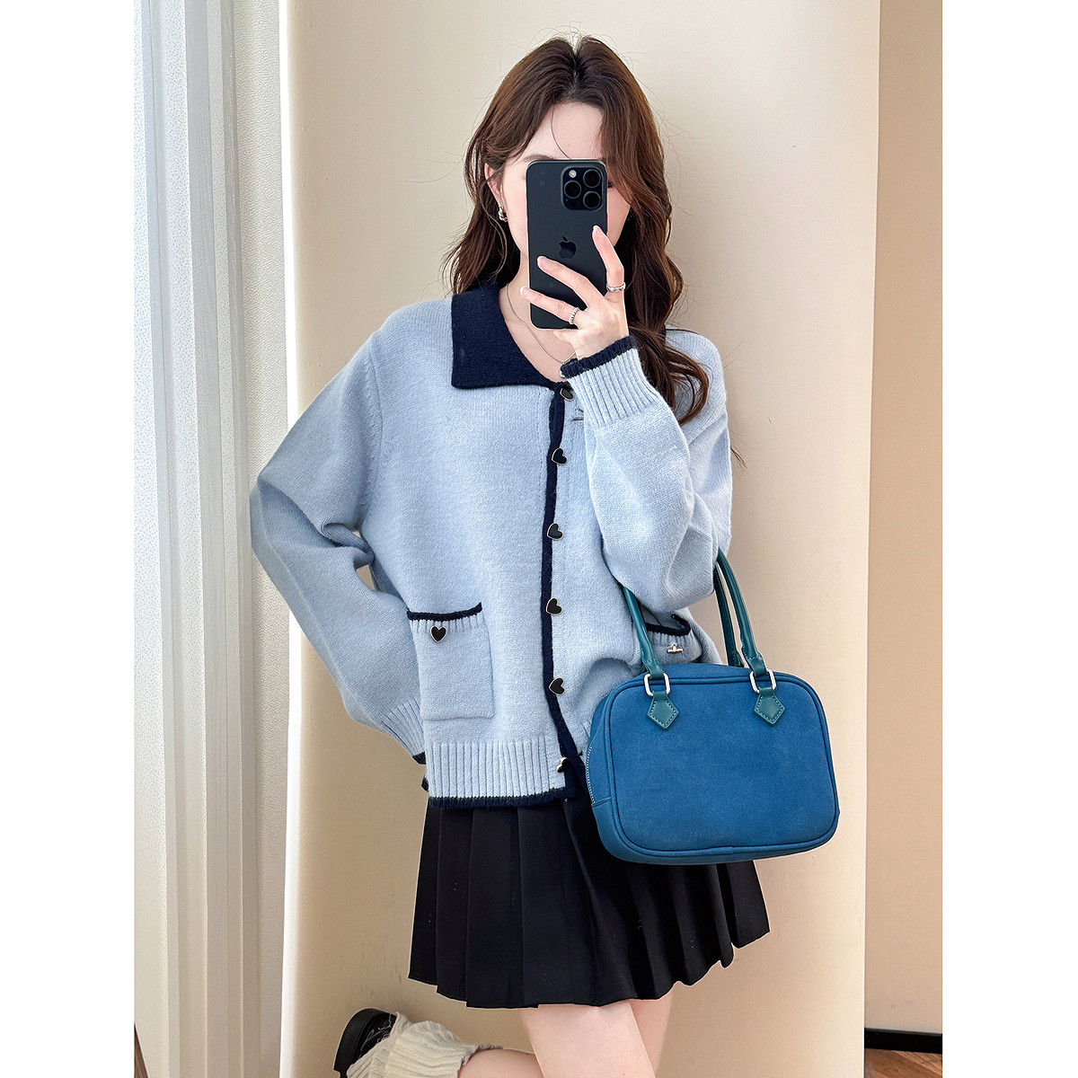 唐狮新款小香风撞色设计开衫毛衣女显瘦甜美气质针织衫上衣ydTD
