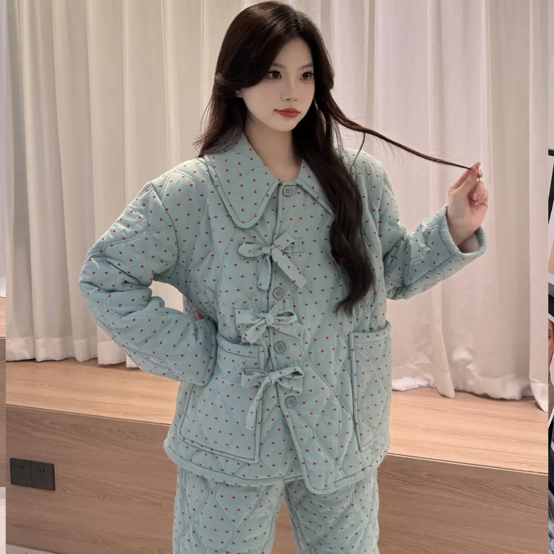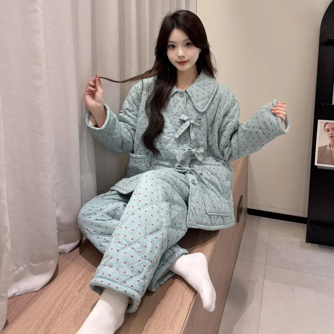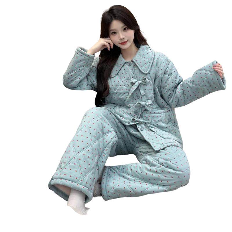 珊瑚绒睡衣女冬季三层夹棉加厚韩版大码女士家居服套装加绒外出