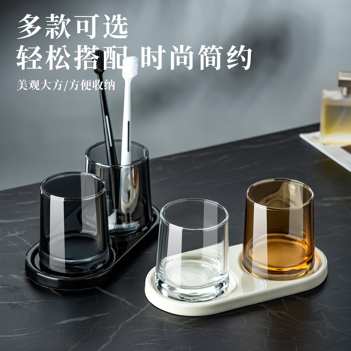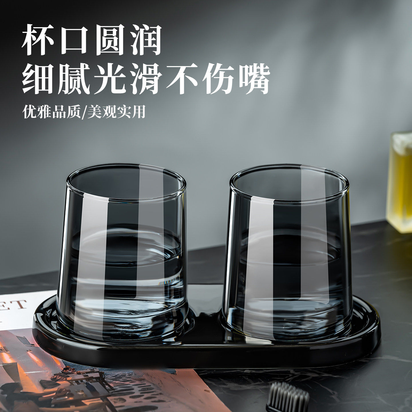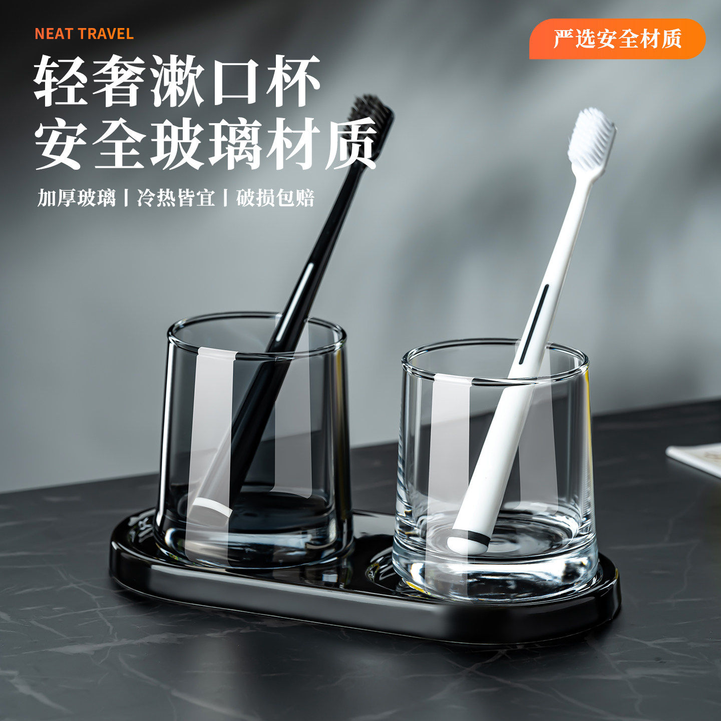 高档酒店漱口杯一对套装收纳托盘民宿黑色玻璃洗漱刷牙杯情侣家用