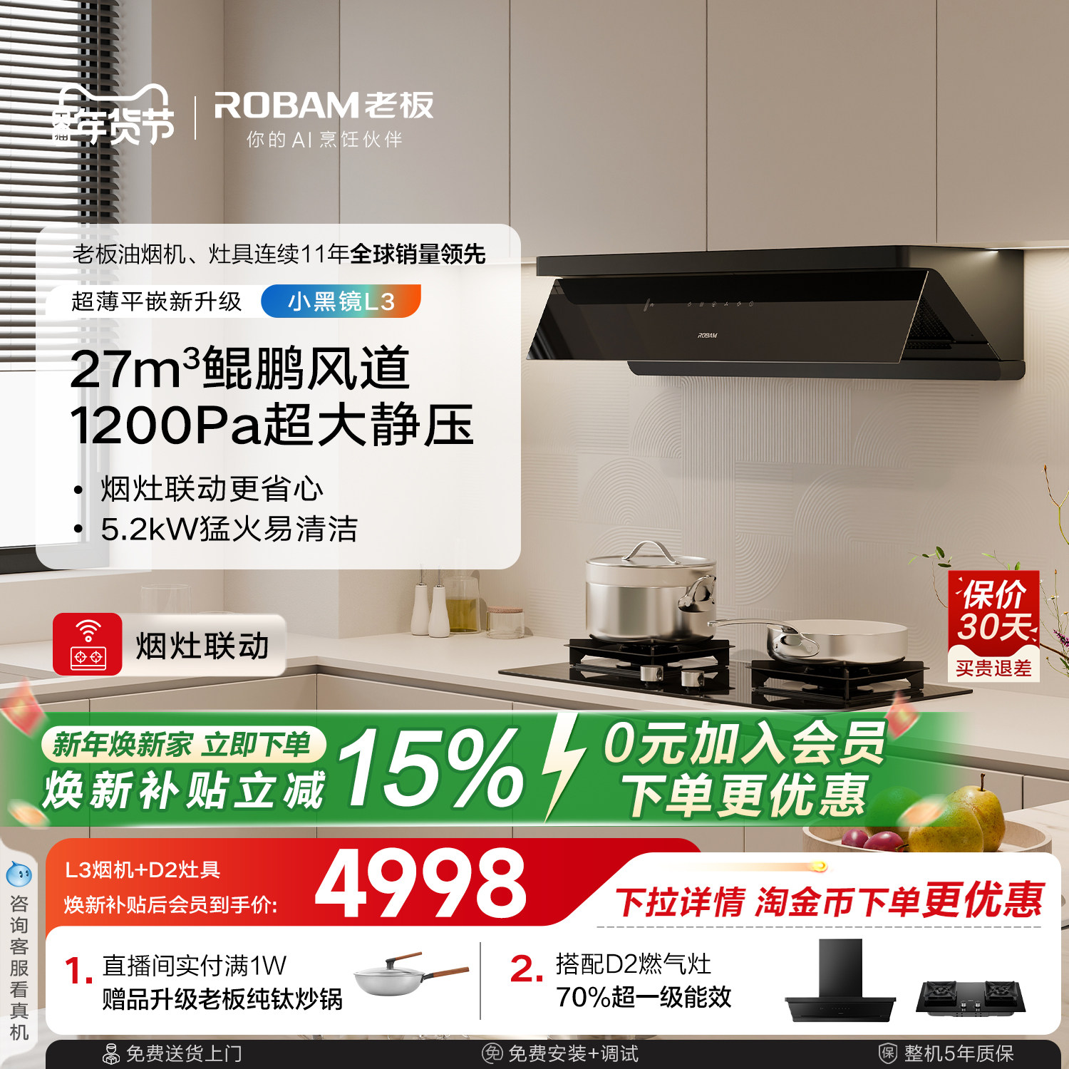 老板小黑镜L3套系大吸力抽油烟机燃气灶一套烟灶套装官方旗舰店