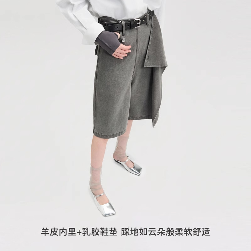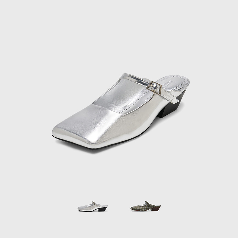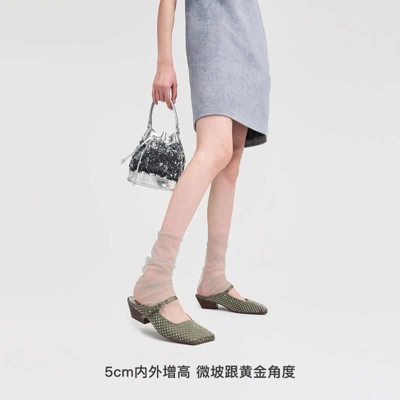 lost in echo春夏时尚个性斜方头坡跟半包高级银色芭蕾舞玛丽珍鞋