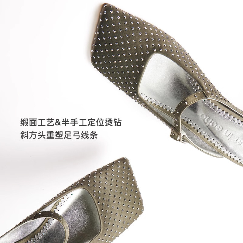 斜方头坡跟穆勒拖鞋 缎面材质手工烫钻