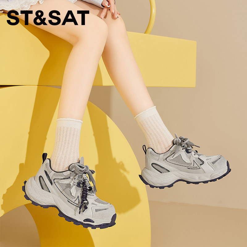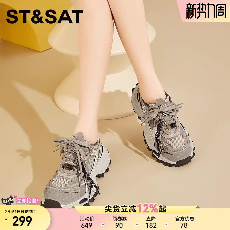 星期六厚底增高老爹鞋女2025新款秋季双鞋带设计网面透气运动鞋女