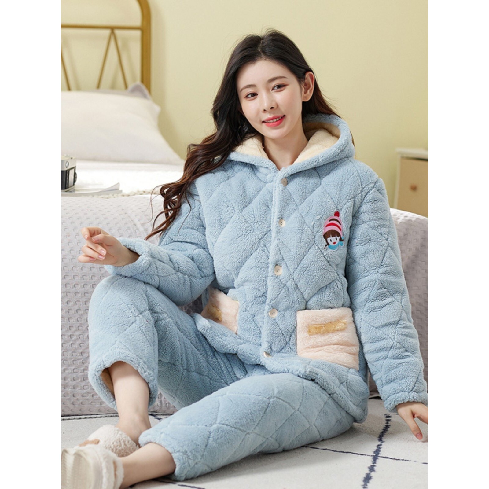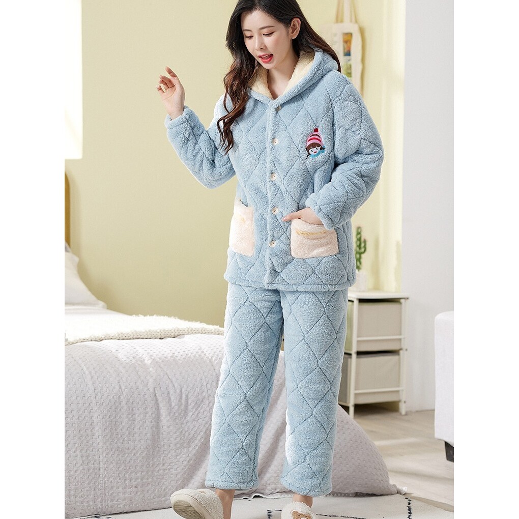恒源祥可外穿睡衣女士冬季法兰绒三层加厚夹棉家居服加绒保暖加长